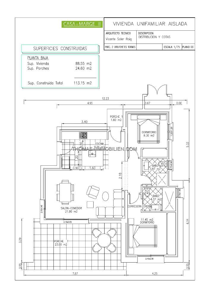 VILLENPROJEKT. Villa von minimalistischem und rustikalem Design zur gleichen Zeit in Tormos, Alicante. Es ist ein Projekt des Baus einer Villa, die die Modernität der Betonstruktur mit Natursteinmauern verbindet, alles auf einem völlig flachen Grundstück von 407 m2. An seiner Fassade sticht die spektakuläre überdachte Veranda hervor, die aus einem einzigen Stück Beton besteht, das von einem Bein getragen wird. Das Haus verfügt über 113 m2 verteilt auf Wohnzimmer, Küche, überdachte Veranda, 2 Schlafzimmer, eines davon mit Bad en suite, und ein Dusch-WC. Der Preis beinhaltet auch ein 8 x 4 Schwimmbad mit Scheinwerfer und Innentreppe der Arbeit, Außenterrasse von ca. 40 m2, Parkplatz mit Naturstein (ca. 30 m2), Fußgängerzugang von der Straße zum Haus, Mauer am Rand des Grundstücks mit der Straße, Schiebetür für Autozugang, Fußgängertür und Gegensprechanlage, Bürgersteige rund um das Haus und natürlich hohe Bauqualitäten, die an den Stil des Hauses angepasst sind. Bauprojekt und Lizenz sind inklusive. Da es sich um ein Projekt handelt, kann der Kunde im Voraus jede Variation im Plan oder in den Konstruktionsqualitäten auswählen. Tormos ist eine kleine und ruhige Stadt, die sich im Herzen der Costa Blanca befindet, nur 20 Minuten von den Sandstränden, 1 Stunde von den Flughäfen Alicante und Valencia und nur 15 Minuten vom größten Einkaufszentrum der Gegend entfernt.