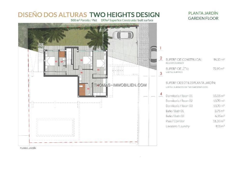 Villa mit 4 Schlafzimmern und 4 Bädern, komplett ausgestattet. Erbaut auf einem großen Grundstück, um den Garten und den privaten Pool, das Aerothermal-System und die Klimaanlage zu genießen.