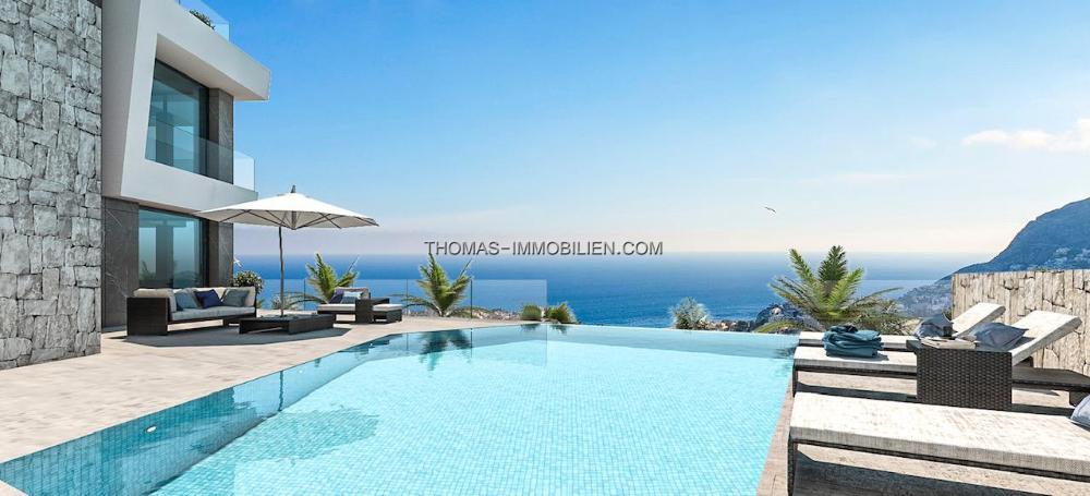 LUXUSVILLA MIT MEERBLICK Moderne freistehende Luxusvilla mit atemberaubendem Meerblick. Das Anwesen verfügt über einen Aufzug, der die 3 Etagen des Hauses miteinander verbindet. Von allen Schlafzimmern und vom Wohnzimmer aus haben Sie einen spektakulären Meerblick. In seinem Infinity-Pool können Sie ein entspannendes Bad nehmen, während Sie spüren, wie Sie mit dem Horizont, dem Mittelmeer und dem blauen Himmel verschmelzen. Die Wohnanlage liegt weniger als 2 km vom Strand und dem Zentrum von Calpe entfernt, wo es alle notwendigen Dienstleistungen gibt. Der Flughafen von Alicante ist 70 km entfernt und Benidorm mit seinem breiten Freizeitangebot ist nur 20 km entfernt. Von Calpe aus haben Sie Zugang zu einem breiten Angebot an Golfplätzen, internationalen Schulen, Häfen und Wassersportarten, einer abwechslungsreichen Gastronomie und das alles in einem Klima mit 300 Sonnentagen im Jahr und einer durchschnittlichen Jahrestemperatur von 20ºC.