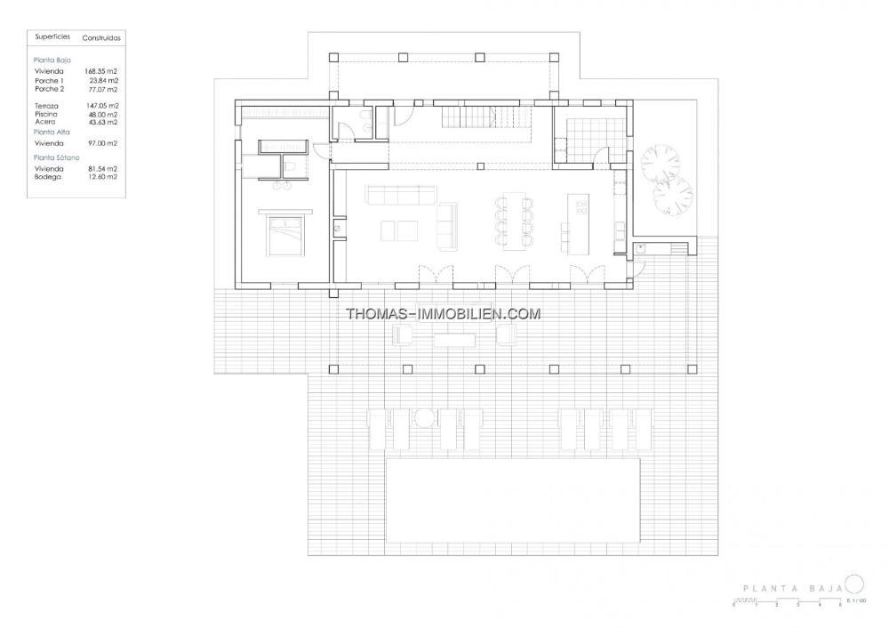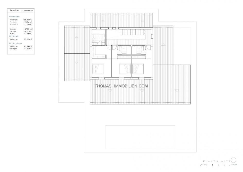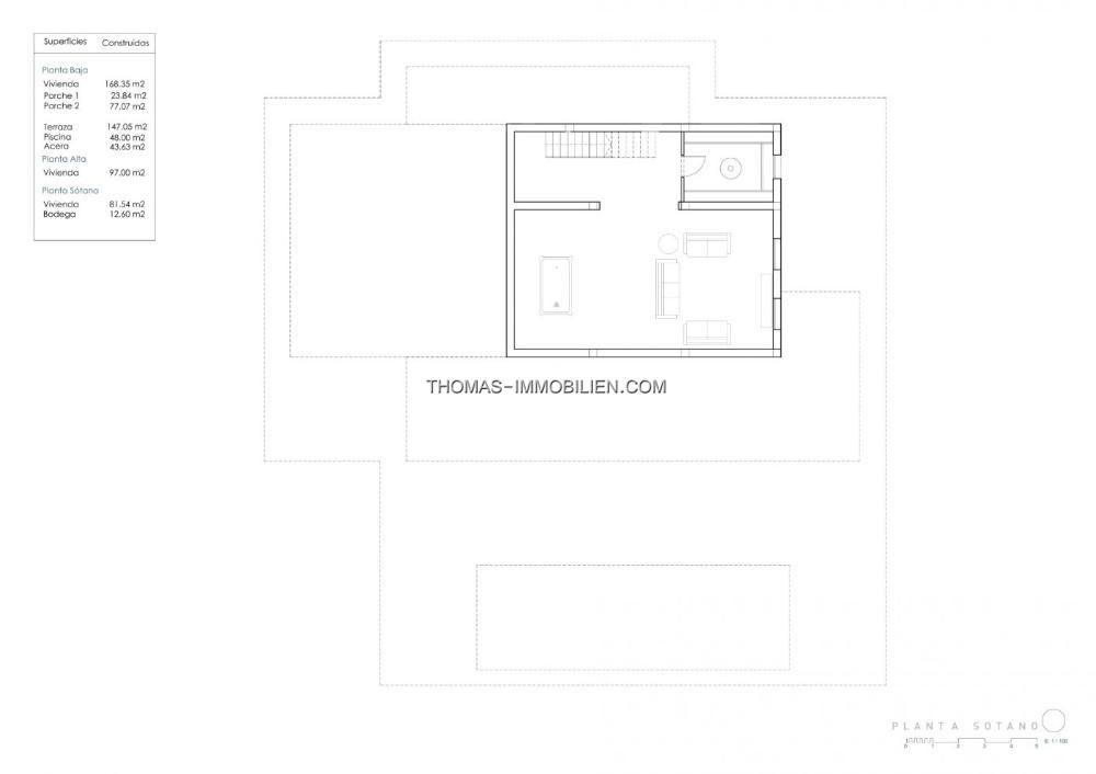 NEU GEBAUTE VILLA IN MORAIRA MIT BLICK AUFS MEER Neubau-Villa in Moraira mit privatem Pool und Meerblick. Im Erdgeschoss finden wir einen großen Wohn-Essbereich und offene Küche, Hauptschlafzimmer mit begehbarem Kleiderschrank und Bad, vordere Terrasse mit Zugang zum Pool. Im ersten Stock befinden sich 3 Schlafzimmer mit Einbauschränken, 3 Bäder en suite. Wie auch hier haben Sie Keller von 81m2 mit Weinkeller. Villa wird mit hochwertigen Materialien gebaut werden. Die Küche wird vom Kunden gewählt werden, Küchenschränke, Arbeitsplatte und Geräte. Klimaanlage mit Klimatisierungssystem (Kondensat) in den Wohn- und Schlafzimmern. Marke Mitsubishi. Das Schwimmbad wird mit einer Außendusche gebaut Dusche (Warm-/Kaltwasseranschluss). Automatisches Einfahrtstor für die Autos mit Fernbedienung und automatische Fußgängertür. Der Garten wird vom Kunden ausgewählt. Moraira ist eine kleine Stadt mit guten Restaurants, Bars und vielen Supermärkten in der Nähe. Es gibt einen sehr angenehmen Strand direkt neben der Stadt, der für Familien geeignet ist. Von der Strandpromenade aus hat man einen herrlichen Blick auf den Penon Ifach auf der anderen Seite der Bucht von Calpe. Die Küstenstraße dorthin ist es wert, mit einigen spektakulären Aussichten. Moraira liegt etwa 1 Stunde und 15 Minuten nördlich der A7 vom Flughafen Alicante entfernt und ist relativ leicht zu erreichen. Vom Flughafen Valencia ist es etwa die gleiche Entfernung oder etwas weniger südlich.