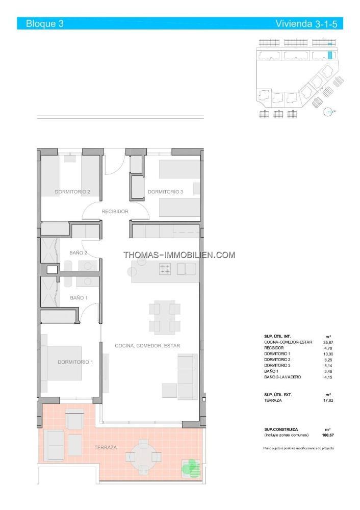 Diese Wohnungen haben 3 Schlafzimmer, 2 Bäder, offenen Salon mit Küche, Erdgeschoss mit privatem Garten, mittlere Etage mit Terrasse und Dachgeschoss mit privatem Solarium.