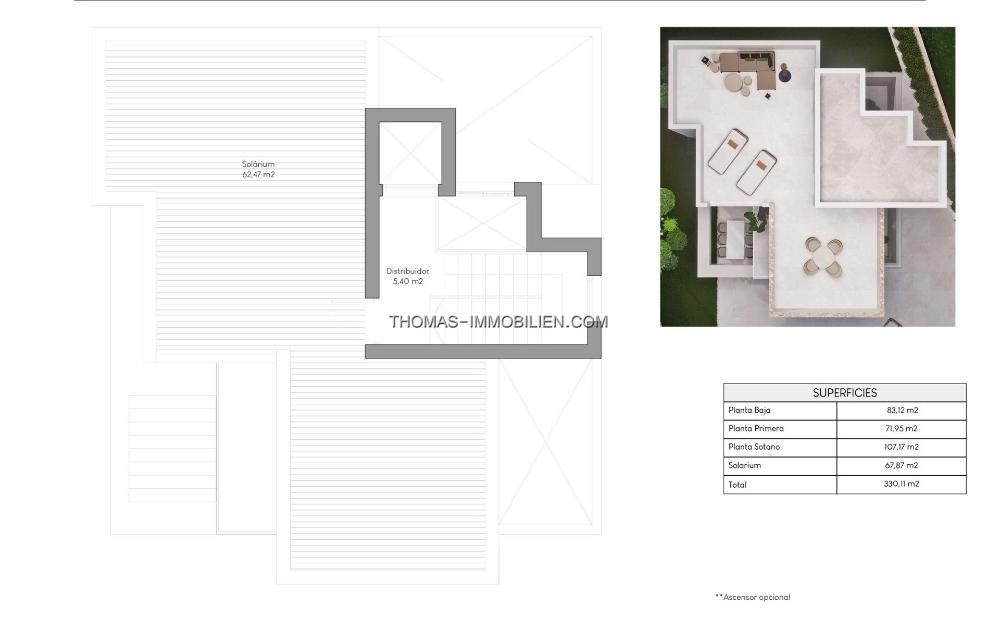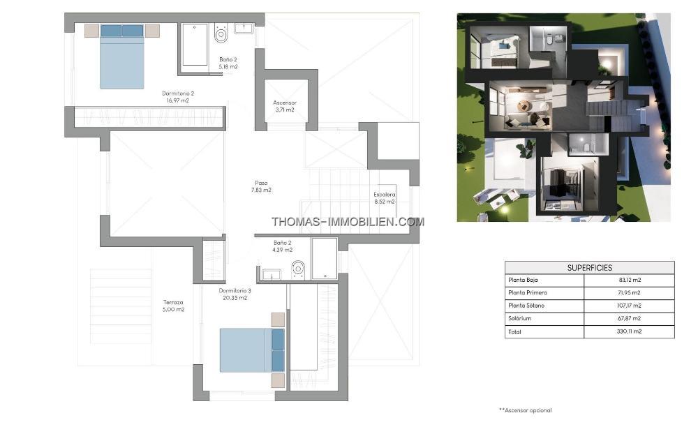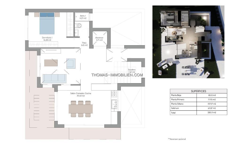 Villen bauen über 2 Etagen, plus Keller, und hat 4 Schlafzimmer, 4 Bäder, offene Küche mit Wohnzimmer, Einbauschränke, private Sonnenterrasse, Garten mit dem Pool und Parkplatz für 2 Autos.