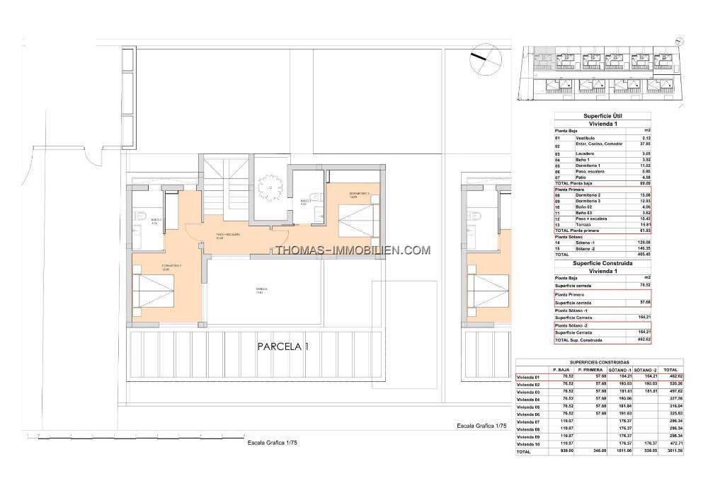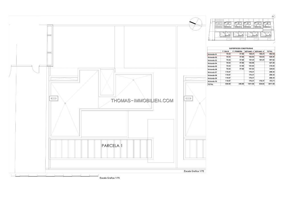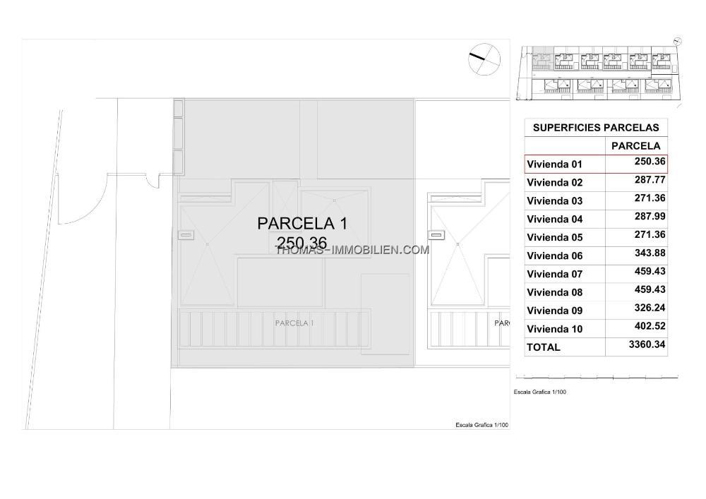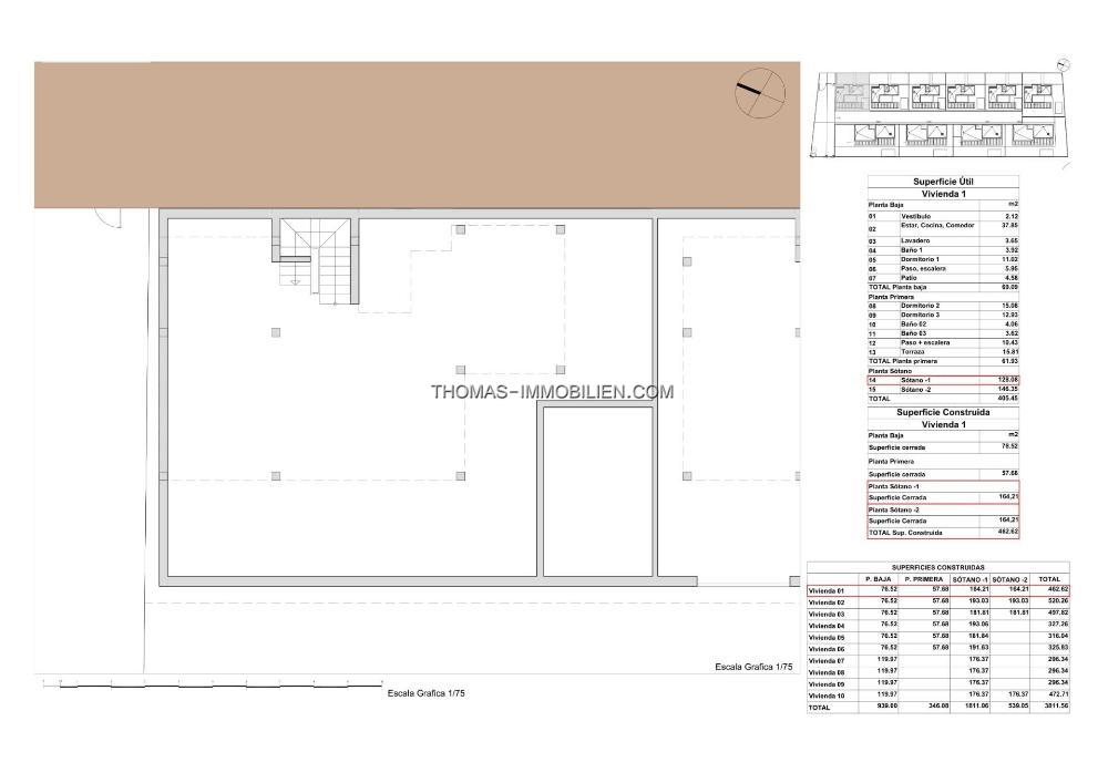 Das Projekt wird in zwei Bauphasen unterteilt, die wiederum zwei Arten von Häusern umfassen, mit 1 oder 2 Etagen, 3 Doppelschlafzimmern, 2 oder 3 kompletten Badezimmern, Wohn-Esszimmer mit integrierter Küche, Waschküche, großer Terrasse und Garten, privatem Pool, Außenparkplatz, 1 oder 2 Mehrzweckkellern und in einigen Modellen geschlossener Tiefgarage.