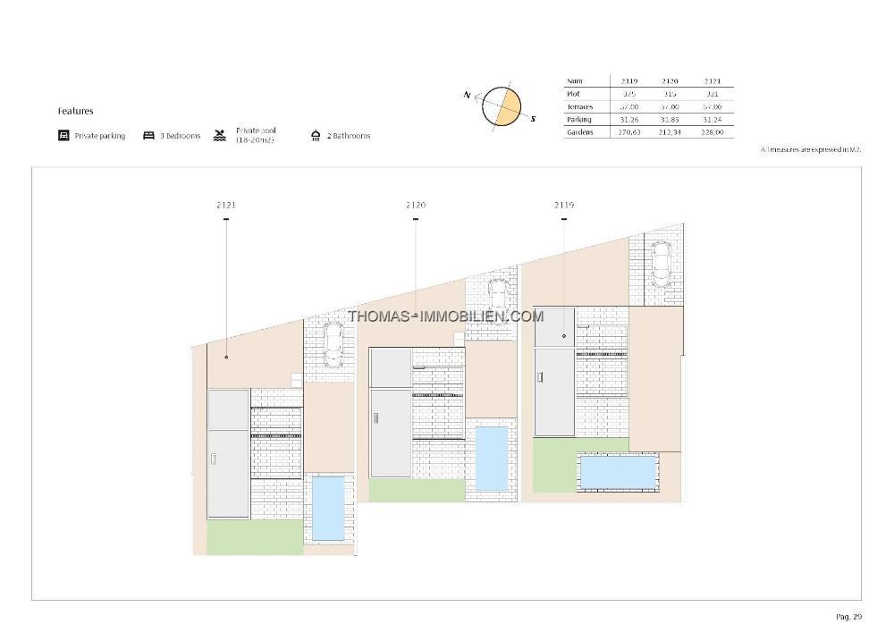 Diese Villen verfügen über eine Reihe von hochwertigen Ausstattungsmerkmalen, die für maximalen Komfort und Sicherheit sorgen. Genießen Sie die Annehmlichkeiten eines privaten Innenparkplatzes, elektrischer Rollläden, einer Klimaanlage und eines ausgeklügelten Hausautomationssystems. Darüber hinaus sorgt ein vollständig installiertes Alarmsystem für Ruhe und Sicherheit. Die Süd-/Südwest-Ausrichtung sorgt das ganze Jahr über für eine optimale natürliche Beleuchtung, die den Energieverbrauch senkt, indem sie von Sonnenaufgang bis Sonnenuntergang für Wärme und Helligkeit sorgt.
