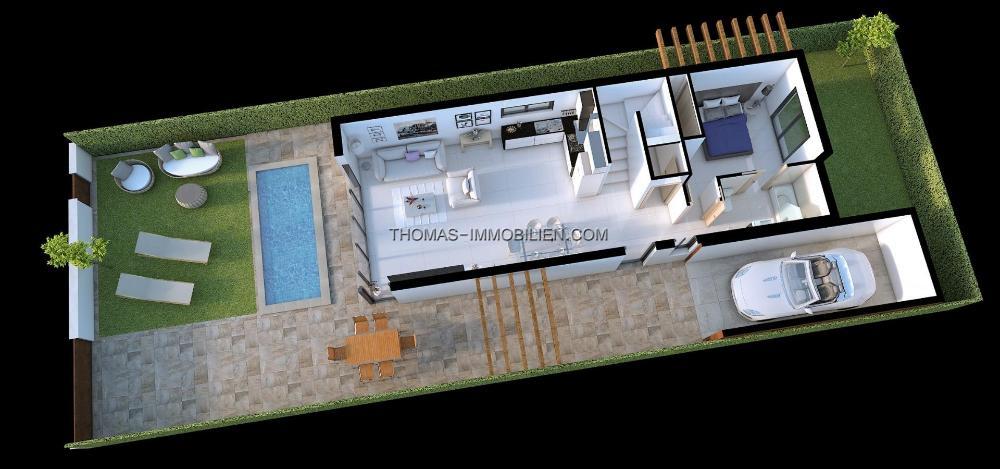 Schöne Villen haben 3 Schlafzimmer und 2 Bäder, offene Küche mit dem Wohnbereich, Einbauschränke, privater Garten mit dem Schwimmbad, Garage.