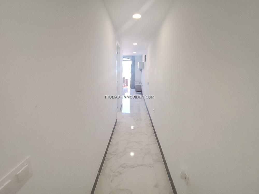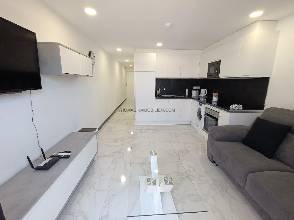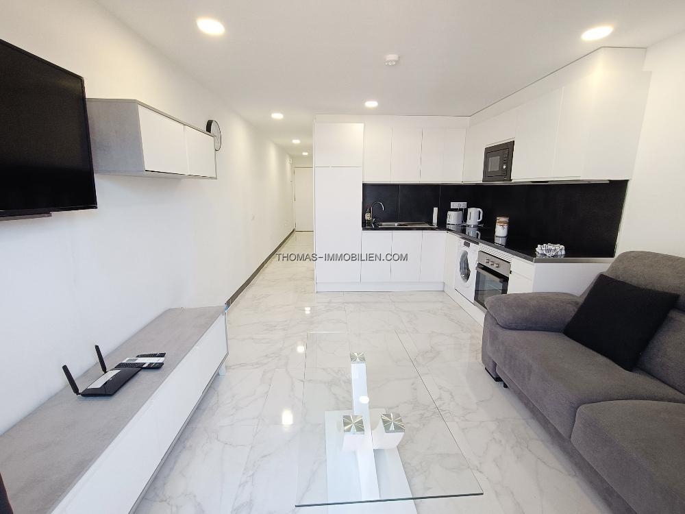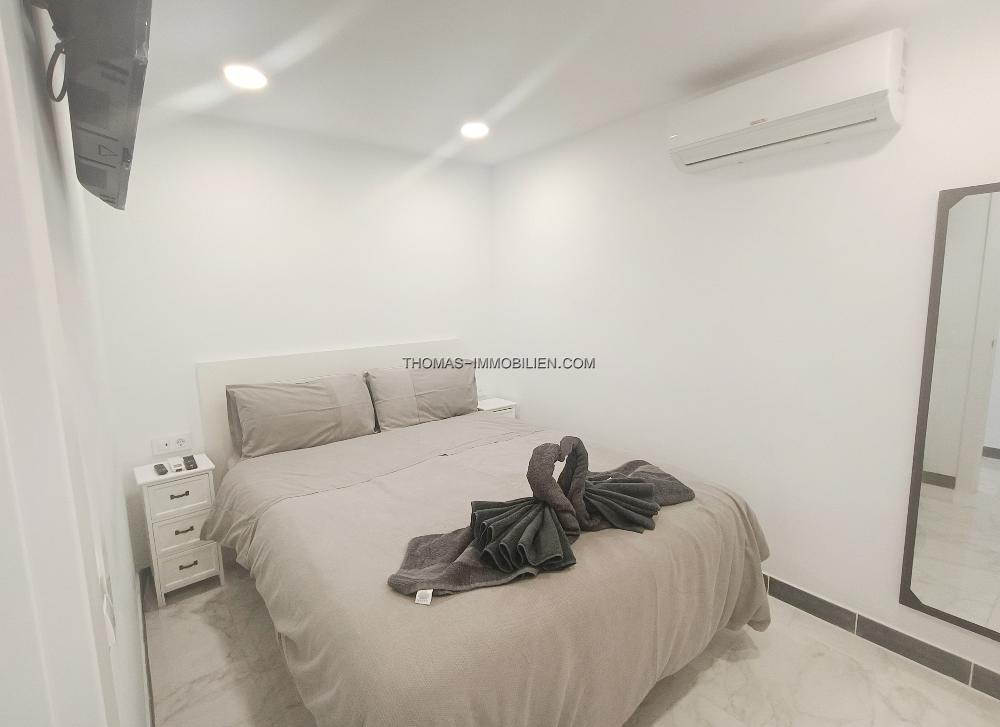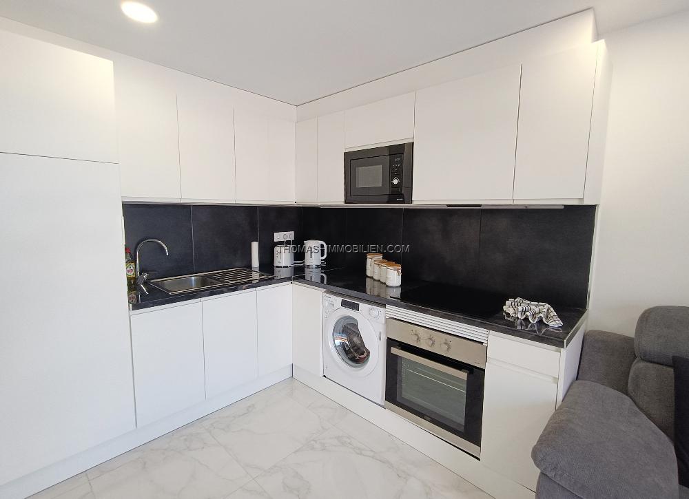 Die Wohnung ist durchgehend klimatisiert und verfügt über einen geräumigen Wohnbereich, einen separaten Schlafbereich mit einem Doppelbett und ein voll ausgestattetes Badezimmer. Die Terrasse ist perfekt zum Entspannen, sowohl tagsüber als auch abends, und die Lage direkt am Meer ist ideal, um Leute zu beobachten. Die sichere Anlage verfügt über eine Rezeption und einen beheizten Swimmingpool.