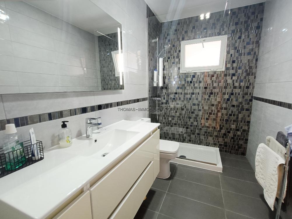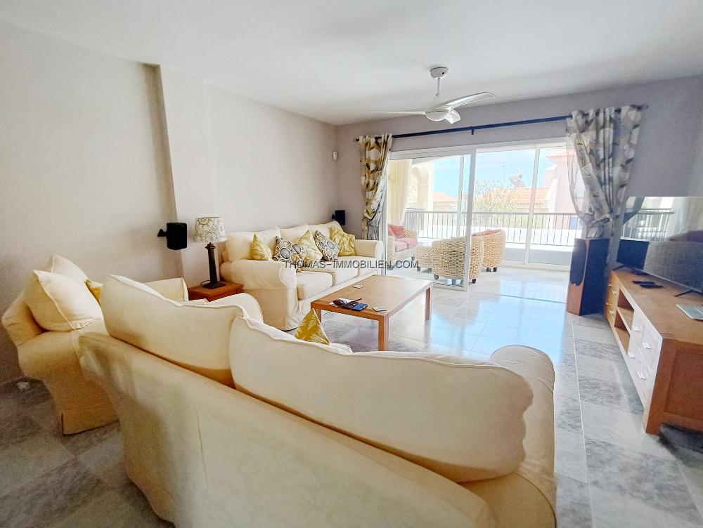 Schon beim Betreten der Wohnung fallen einem die offene Küche und das Wohnzimmer auf, die immer weiter zu gehen scheinen. Die Küche ist gut ausgestattet und es gibt einen großen Abstellraum, in dem auch die Waschmaschine untergebracht ist. Das Wohnzimmer und der Essbereich sind hell und lichtdurchflutet und führen direkt auf die geräumige Terrasse, die 24 Quadratmeter groß ist und in der Morgensonne glänzt. Die Terrasse ist mit Schiebefenstern versehen, die auch an kühleren Abenden für Komfort sorgen. Beide Schlafzimmer sind sehr groß und verfügen über Einbauschränke. Das Hauptschlafzimmer verfügt über ein renoviertes Bad en-suite, und ein zweites Bad befindet sich neben dem Gästezimmer. Die Wohnung ist geschmackvoll eingerichtet und wird so verkauft, wie sie gesehen wurde, mit Ausnahme einiger persönlicher Gegenstände.