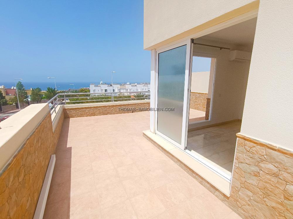 Die geräumige, nach Südwesten ausgerichtete Hauptterrasse, die vom Wohnzimmer aus zugänglich ist, ist mit Kunstrasen ausgestattet, der ein Gefühl von Komfort vermittelt, ohne dass es anstrengend ist. Im Erdgeschoss befindet sich auch ein separates WC. Die drei Schlafzimmer befinden sich alle im Obergeschoss und bieten Einbauschränke, zwei Bäder (eines davon en-suite). Zwei der Schlafzimmer haben Zugang zu einer großen Terrasse, die ebenfalls nach Süden ausgerichtet ist und teilweise Meerblick mit atemberaubenden Sonnenuntergängen bietet.