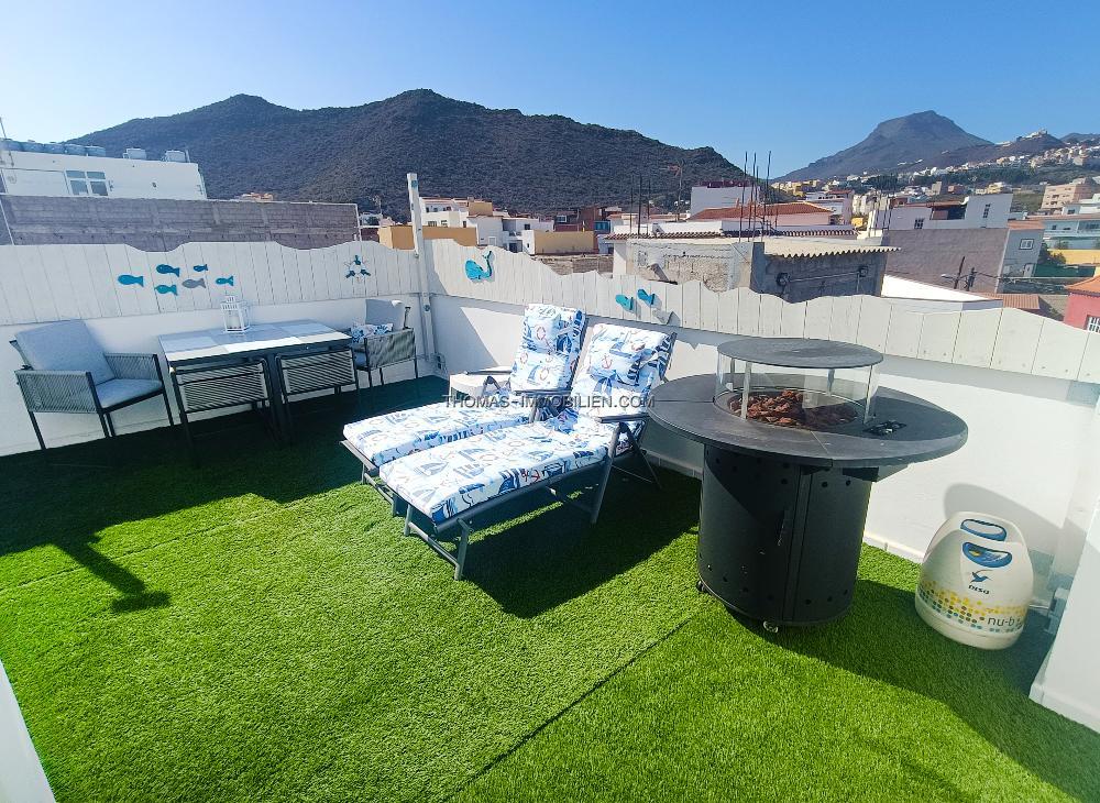 Es gibt eine private Dachterrasse, die durch ein Tor abgetrennt ist, ausgestattet mit Sonnenliegen und einem Tisch und Stühlen, wo Sie sich entspannen und den Panoramablick auf die Insel genießen können.