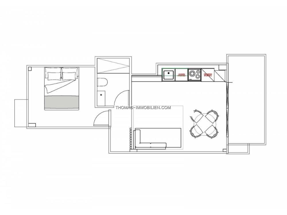 Ein Schlafzimmer mit Einbauschrank, ein Badezimmer mit Dusche, voll ausgestattete Küche, Wohn-Essbereich mit Zugang zum Balkon, integrierte Klimaanlage mit Wärmepumpe, Parkettboden. Schöner Gemeinschaftsgarten. Gebäude ohne Aufzug. Bezugsfertig!