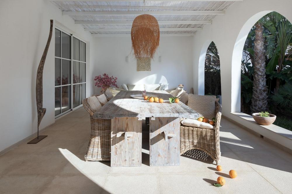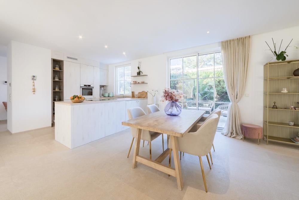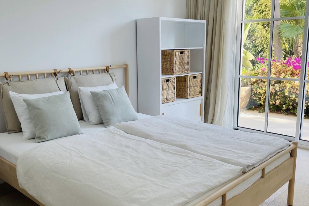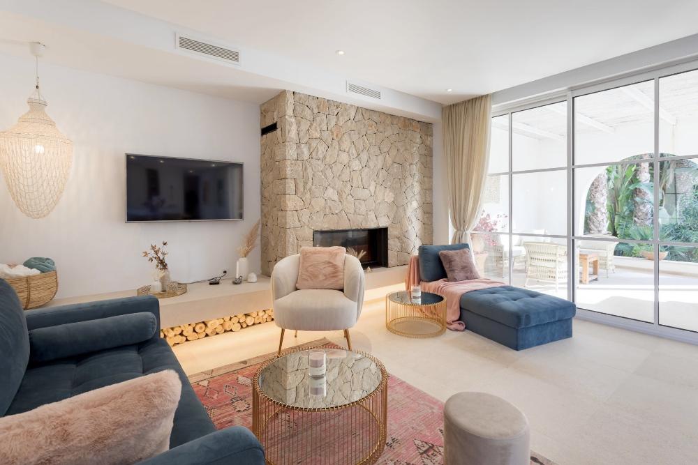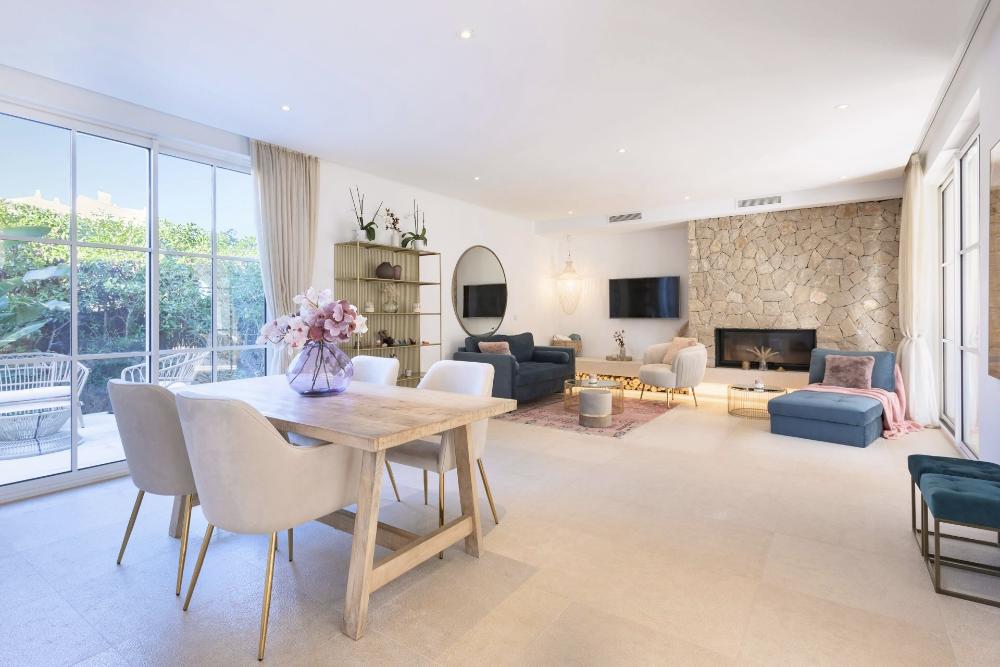 Dieses wunderschöne, sehr moderne und luxuriöse Haus von ca. 218 qm ist in eine offene Küche mit einem großzügigen Ess- und Wohnbereich aufgeteilt. Der Flur führt zu 3 Schlafzimmern, einem Hauptschlafzimmer mit Bad en-suite und einem weiteren separaten Gästezimmer mit Gäste-WC. Die schönen Natursteinböden, die glamourösen Möbel und das Dekor schaffen ein dauerhaftes Urlaubsgefühl der Entspannung und guten Energie. Von allen Schlafzimmern und Teilen des Wohnbereichs haben Sie Zugang zum Garten, der mit schönen wilden Bananen und Palmen bepflanzt ist und zum 30 qm großen Salzwasserpool führt, in dem Sie in den wärmeren Sommermonaten ein erfrischendes Bad nehmen können. Es gibt auch eine überdachte Terrasse mit einem Sitzbereich und einem großen und schönen Esstisch aus Holz, wo Sie das ganze Jahr über im Freien speisen können.\nDas Haus verfügt über ein separates Gästestudio mit Bad, das über eine separate Außentreppe zu erreichen ist. Es gibt eine große und sonnige Terrasse von über 40 qm, auf der Sie die Sonne genießen oder sogar Yoga bei Sonnenuntergang praktizieren können. Das Haus ist komplett ausgestattet für einen komfortablen Aufenthalt mit zentraler Klimaanlage (warm/kalt), einem gemütlichen Kamin, Alarmanlage und es gibt zwei Parkplätze mit überdachten und nicht überdachten Parkplätzen. In der Nähe Annehmlichkeiten, Restaurants und schöne Strände sind zu Fuß erreichbar.