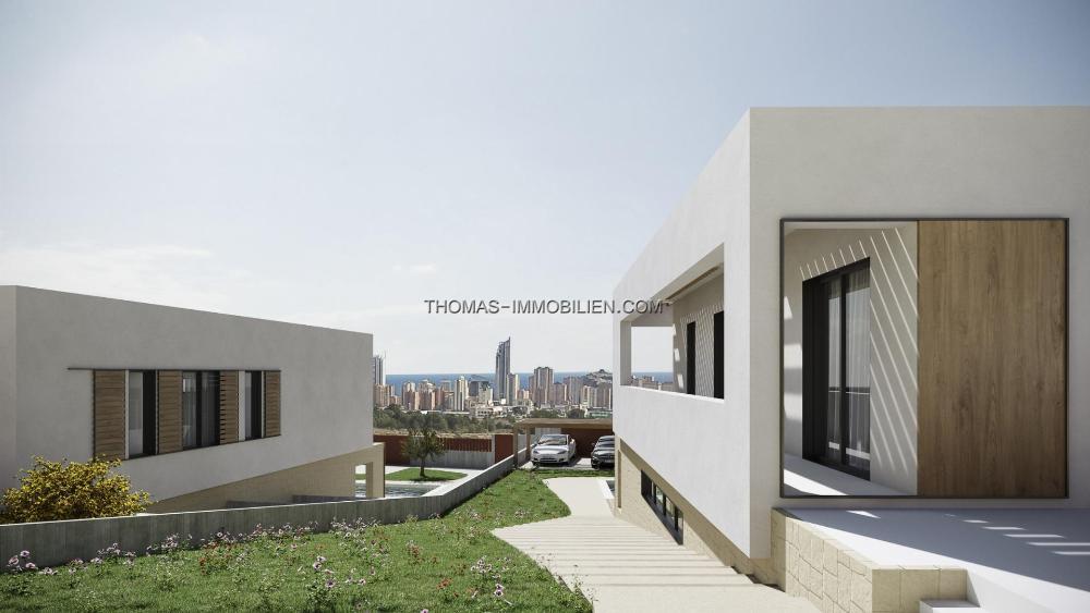 NEU GEBAUTE VILLEN IN FINESTRAT Neubau Moderne Villen in Finestrat. Villen mit 3 Schlafzimmern und 3 Bädern, offener Küche mit Wohnbereich, Terrasse mit herrlichem Blick über Benidorm, privatem Garten mit Schwimmbad und Parkplatz. Es ist als vollständig begehbarer Raum mit Innen- und Außenwegen konzipiert, die einen unabhängigen Zugang zu jeder Etage ermöglichen. Dieser Entwurf bietet verschiedene Perspektiven auf den architektonischen Komplex und seine Umgebung, wobei das Meer und die Sierra Cortina als malerische Kulisse dienen. Der Haupteingang der Villa befindet sich im unteren Teil des Grundstücks und bietet ausreichend Parkmöglichkeiten für zwei Fahrzeuge. Ein Wasserspiel mit Liegestühlen führt Sie in das Erdgeschoss, das sich durch breite, gemauerte Wände auszeichnet. An das Wohnzimmer schließt sich nahtlos eine Terrasse an, die durch ein großes Klappfenster ermöglicht wird. Hölzerne Fensterläden an gemauerten Wänden bieten einen teilweise überdachten Außenbereich für zusätzlichen Komfort. Der Pool mit seinen aquamarinfarbenen Tönen und seiner Auskleidung aus Gresit grenzt an einen Fußbodenbereich aus rutschfesten Porzellanfliesen in Holzoptik. Zu diesem Bereich gehört auch ein Grillplatz, der je nach den Bedürfnissen des Nutzers gestaltet werden kann und über einen gepflasterten Bereich durch das natürliche Gelände zugänglich ist. Finestrat liegt in der Region Marina Baixa an der Costa Blanca, in der Nähe des benachbarten Benidorm und etwa 40 Kilometer von der Stadt Alicante und dem internationalen Flughafen entfernt. Das Dorf liegt am Berghang des Puig Campana und bietet einen schönen Blick auf die Berge, die Küste und das Mittelmeer. Benidorm ist nur fünf Autominuten von den Grundstücken entfernt und bietet alle Dienstleistungen, die Sie benötigen, wie Geschäfte, Bars, Restaurants, Supermärkte, Banken, Apotheken und mehrere private internationale Schulen.