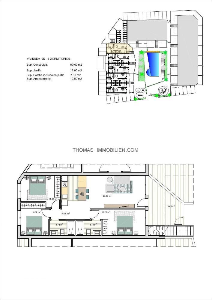 Diese exklusiven Bungalows sind mit 3 Schlafzimmern und 2 Bädern, Terrasse im Erdgeschoss und mit 2 Schlafzimmern und 2 Bädern und Solarium für das Obergeschoss konzipiert.