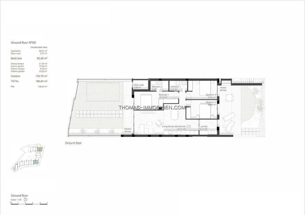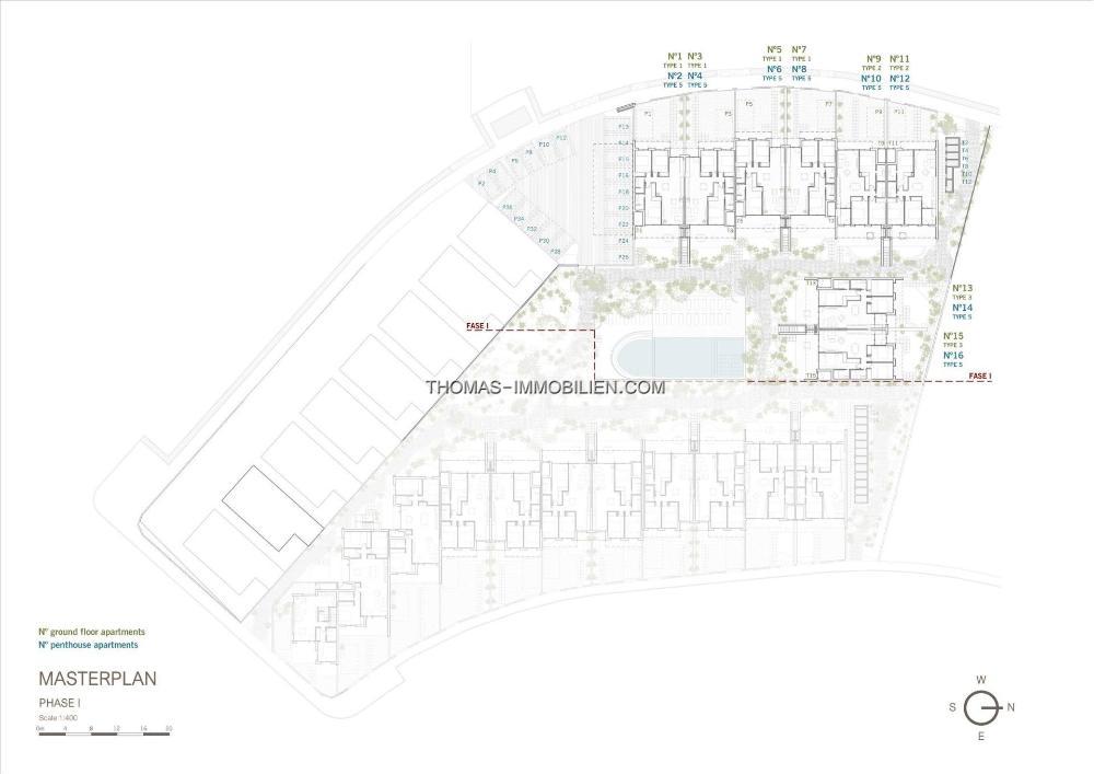 Die 18 Bungalows im Erdgeschoss verfügen über eine Innenterrasse und einen Garten, die zu den Gemeinschaftsgärten und dem Poolbereich führen, sowie über eine große, eingezäunte Terrasse und einen Garten auf der Rückseite.