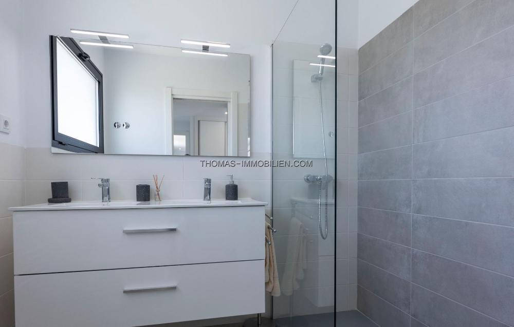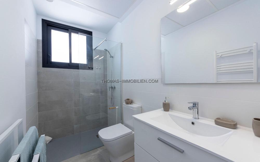 Mattschwarze Aluminiumfenster, motorisierte Jalousien, gepanzerte Eingangstür zum Haus, weiß lackierte Innentüren, aerothermisches System zur Warmwasserbereitung, Quarz (Silestone)-Arbeitsplatte in der Küche, Elektrogeräte inklusive, Vorinstallation der Klimaanlage durch Kanäle.