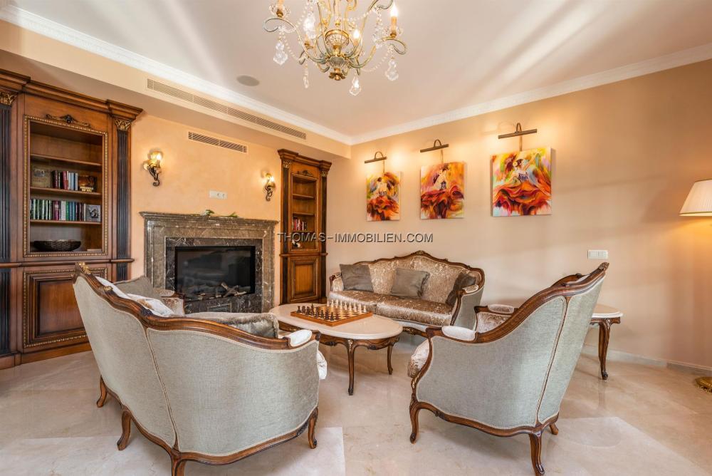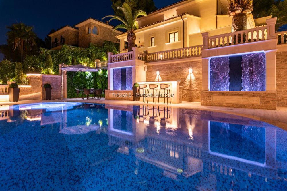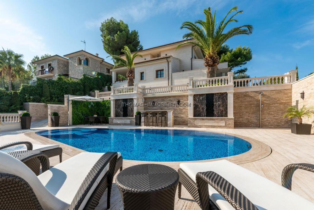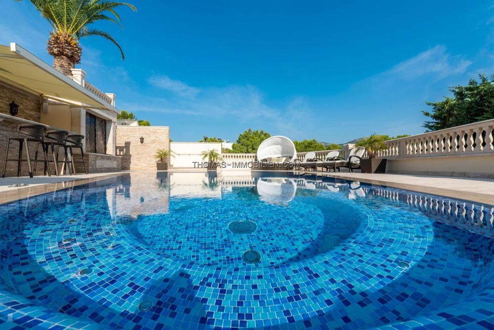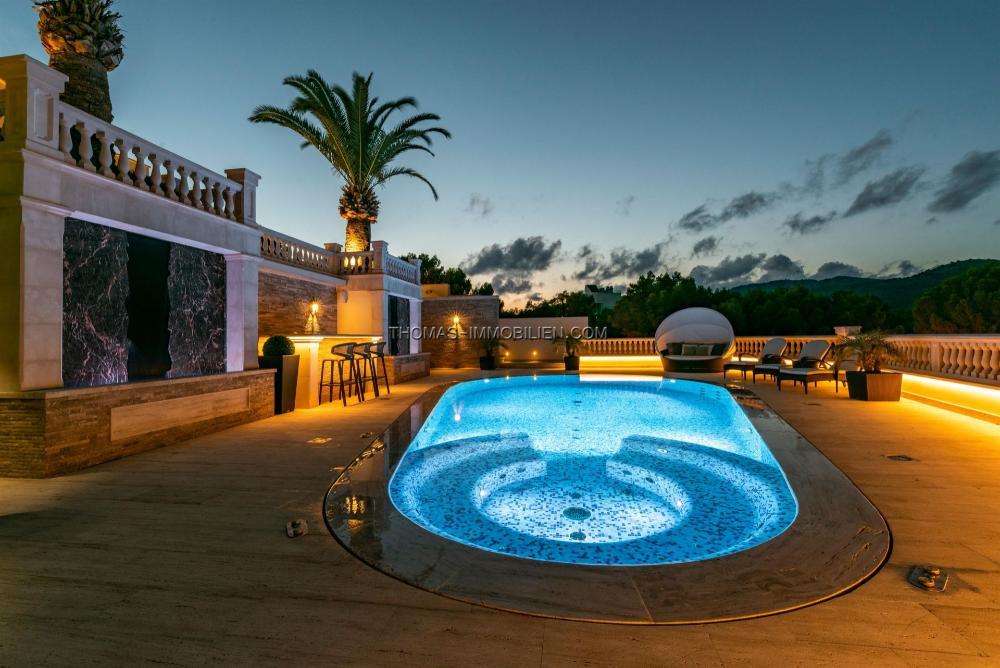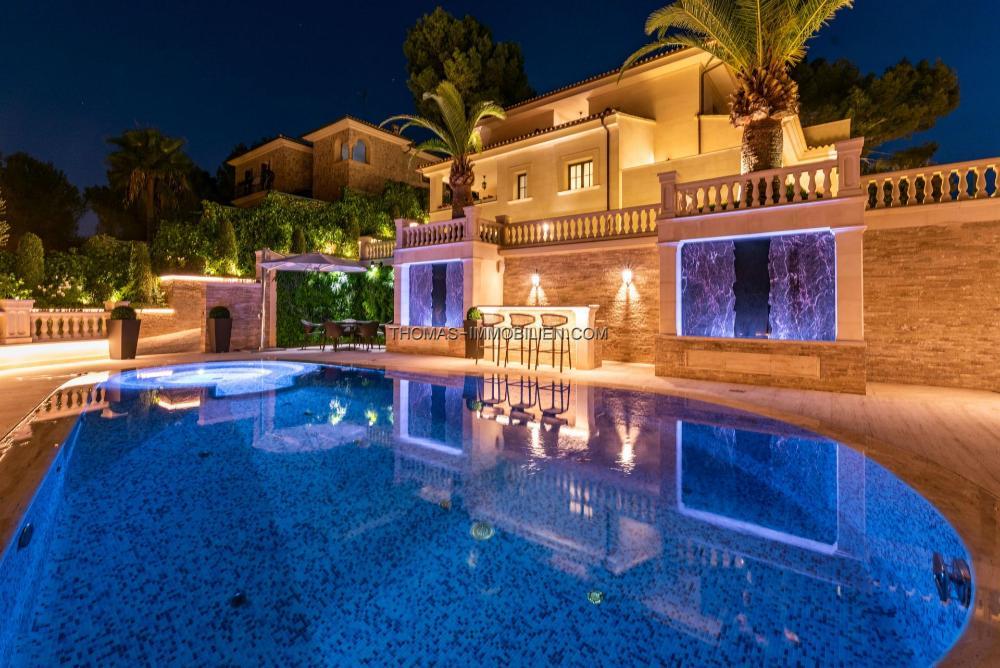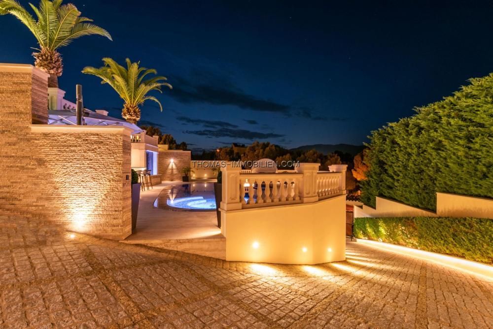 Riesiger 98 m3 großer beheizter Salzwasserpool mit Jet und ausgeklügeltem Reinigungssystem, Whirlpool, Fußbodenheizung, Sauna, Osmose, Smart Home, Marmorböden, große Garage für 3 Autos, Gaskamin, Alarm, Videoüberwachung, spezielles Lichtsystem, Soundsystem.