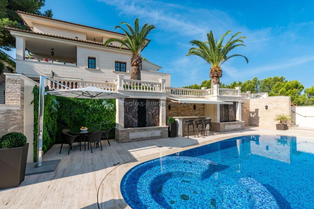In den schönsten und ruhigsten Gegenden von Paguera steht eine herausragende Villa mit Meerblick von höchster Qualität in Strandnähe (350 m) zum Verkauf. Einfacher Zugang von der Autobahn. Grüne Umgebung. Ruhe und Natur.
