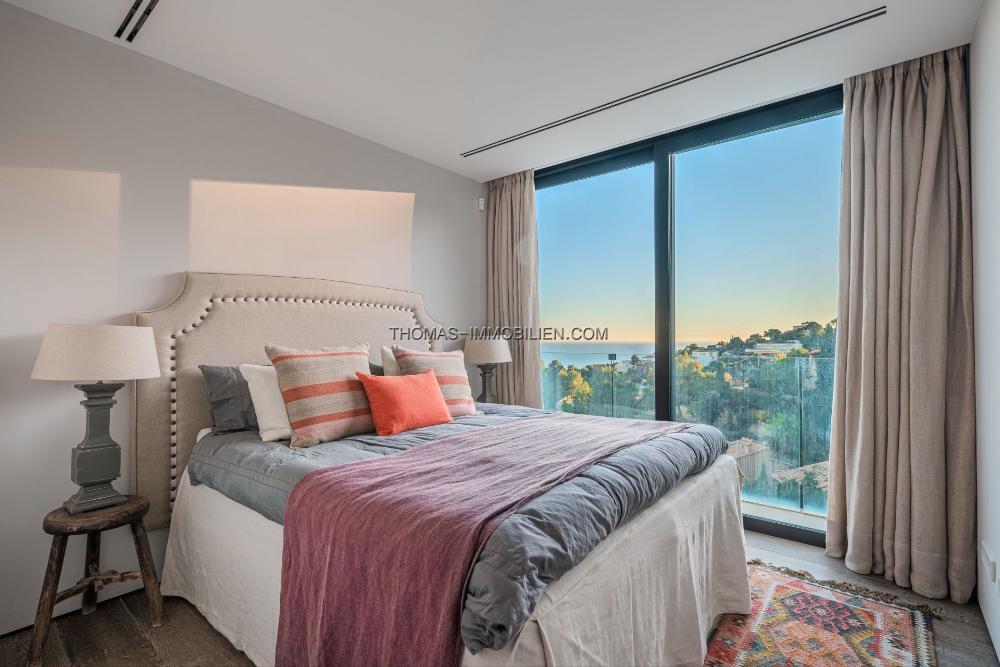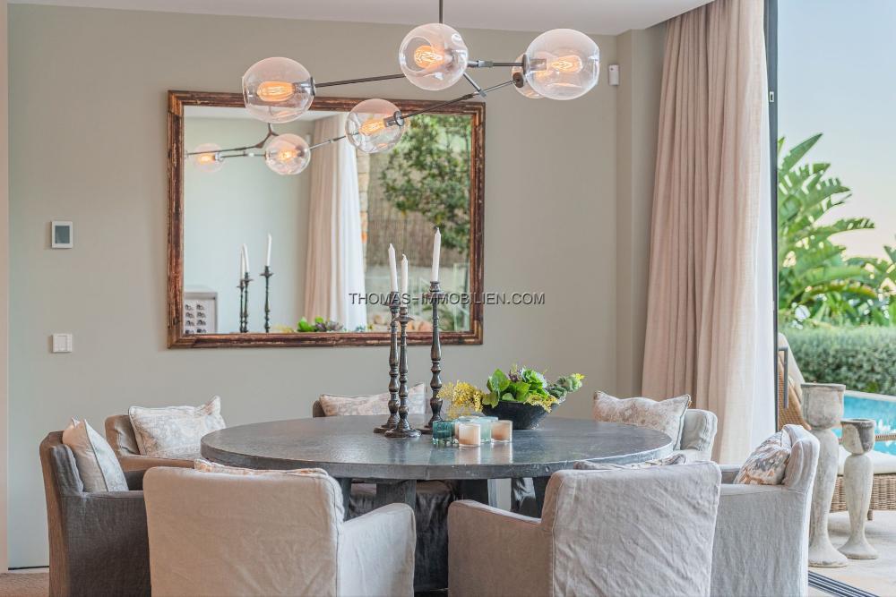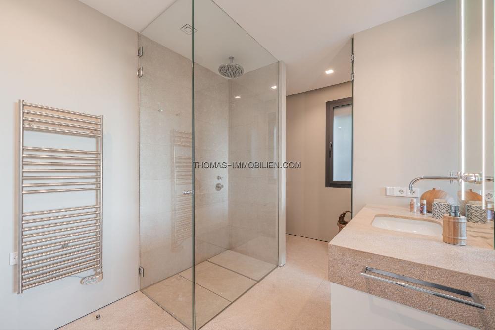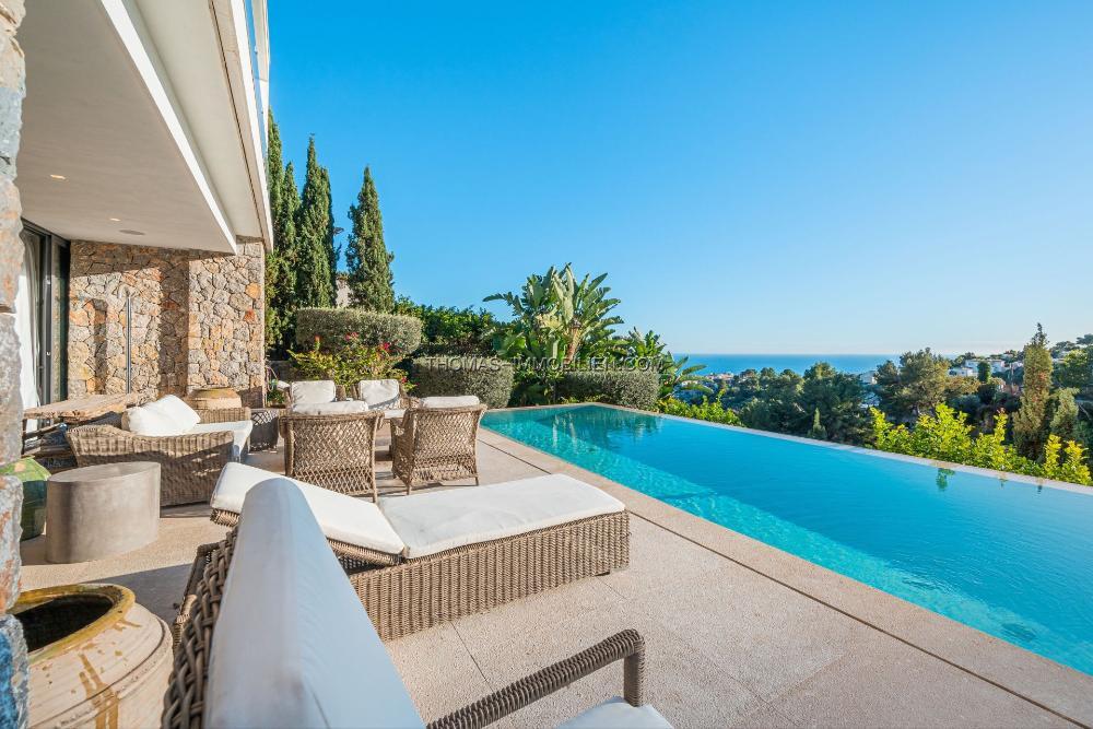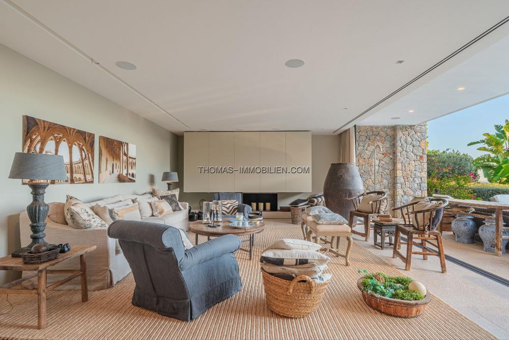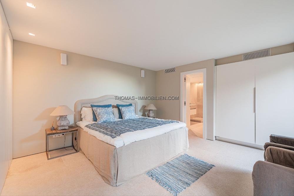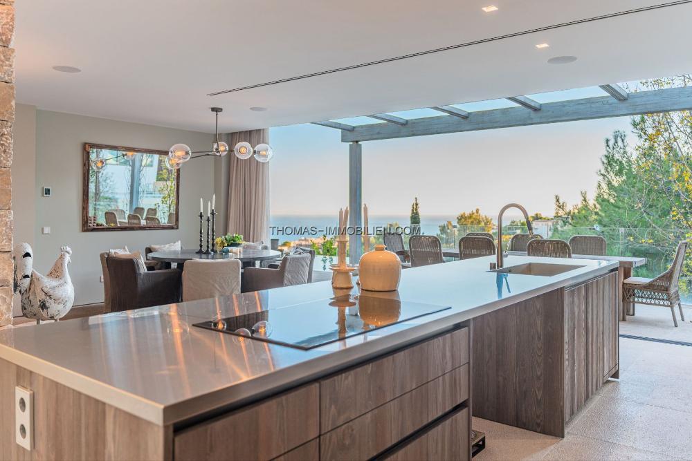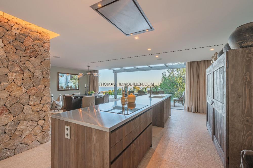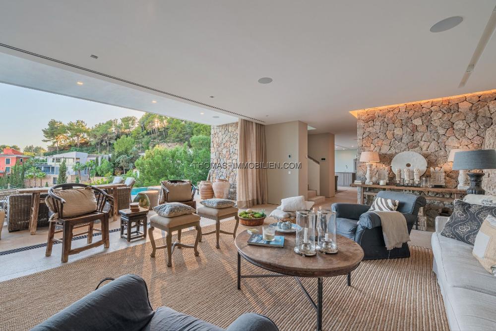 Das Erdgeschoss umfasst ein großes Wohnzimmer, eine offene Designerküche, einen Hauswirtschaftsraum und einen Essbereich, der auf eine großzügige Terrasse führt. Der Poolbereich ist prächtig und bietet Ausblicke über die Bucht von Palma und das historische Dorf Genova. Unterhalb des Poolbereichs befindet sich eine Gäste- oder Personalwohnung.