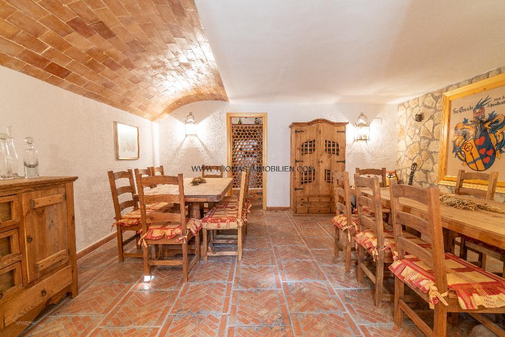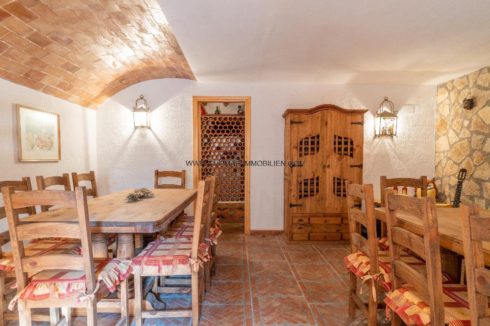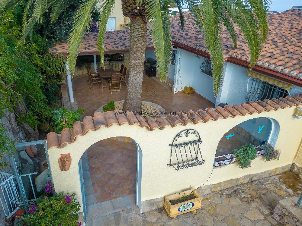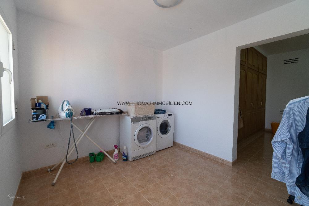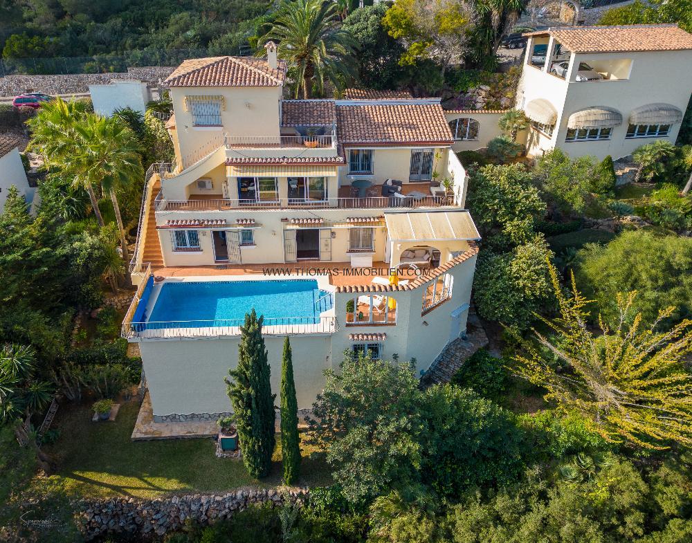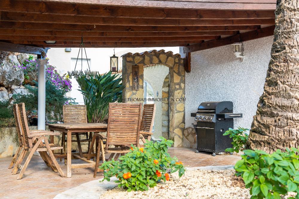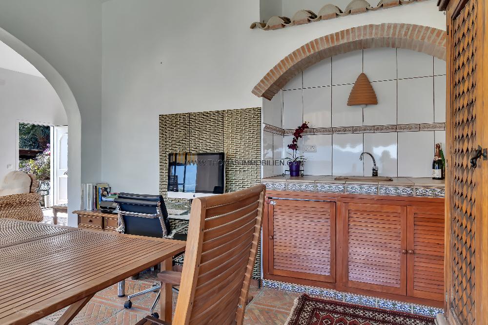 Zusätzlich zu den 3 Terrassen mit Meerblick, gibt es auch eine überdachte Veranda mit Grillecke und Platz für einen großen Esstisch. Ein schöner Ort für ein Essen im Freien. Neben der heimeligen Terrasse mit Fischteich und Wasserfall ist der Weinkeller mit sehr geräumigem Aufenthaltsraum und zwei großen Tafeln ein weiteres Highlight des Anwesens. Hier lassen sich vortrefflich Familienfeste feiern und nach spanischem Stil das Leben Zelebrieren ! Als zusätzliches Plus kann man das separate Studio bezeichnen. Mit separatem Eingang einem gemütlichen offenen Wohn / Schlaf / Ess – und Küchenbereich einem Bad, könnte es hervorragend für Zugeh - oder Care Personal verwendet werden. Des weiteren gibt es eine geschlossene Garage mit Rolltor und ein offener Carport so wie weitere Stellplätze auf dem Grundstück. Wie die gesamte Villa, kann auch der Außenbereich als großzügig bezeichnet werden. Eine parkähnliche Gartengestaltung erfreut den Betrachter und lädt zum Verweilen ein. Etwas weiter geht die Terrasse in eine Rasenfläche über. Der gesamte Pool – und Terrassenbereich ist vollständig unterkellert und teilweise ausgebaut und bietet weitere schier unendliche Möglichkeiten. Wie zum Beispiel einen Fitness- oder Wellnessbereich im schon ausgebauten und gefliesten Bereich. Das Anwesen befindet sich am Rande des Wohngebiets, und ist umgeben von immergrüner einheimischer Bepflanzung und vermittelt den Eindruck mitten in der Natur zu leben.