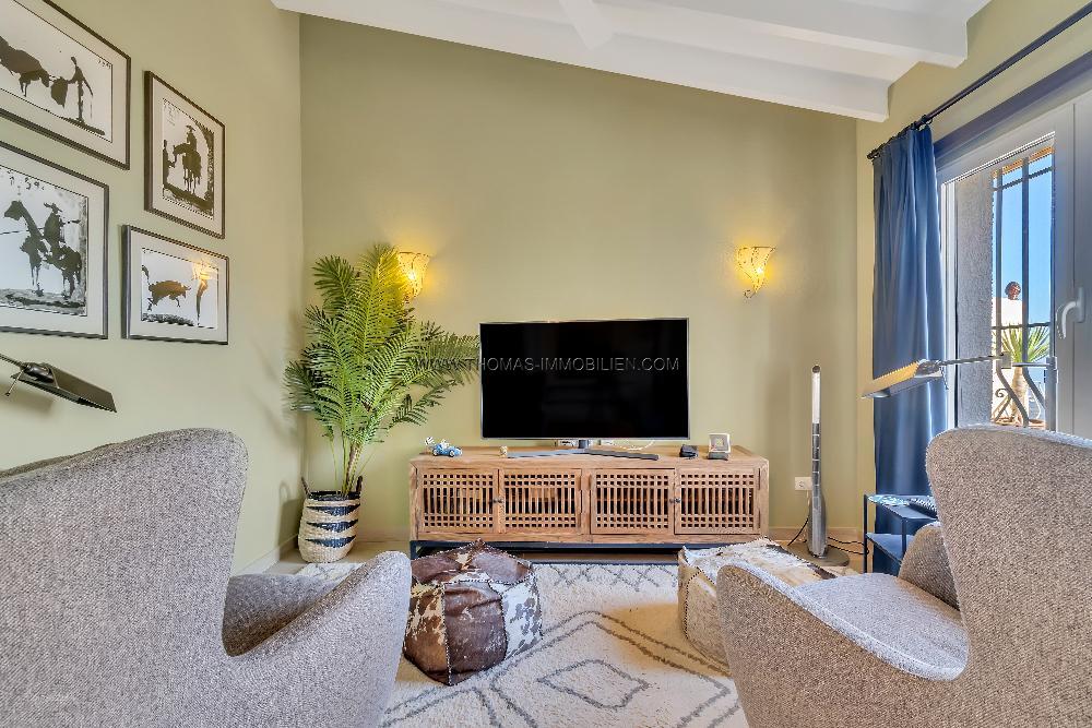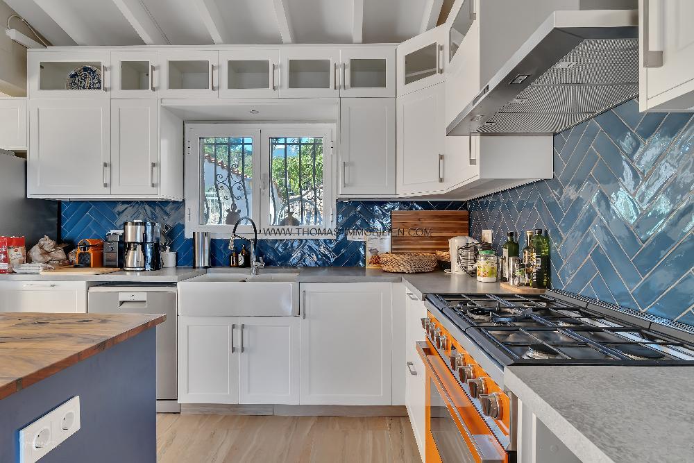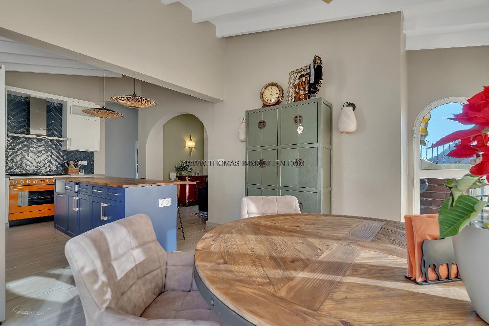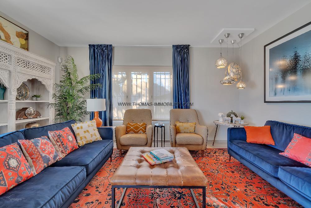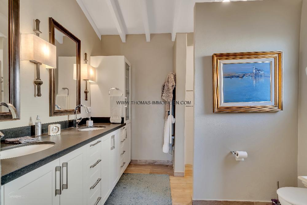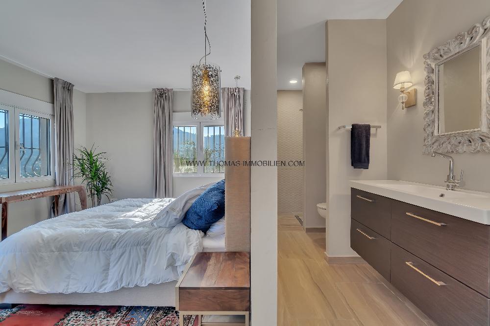 Es gibt auch eine Gästetoilette. Die moderne Küche ist bereits voll ausgestattet mit einem amerikanischen Side-by-Side Kühlschrank und einem weiteren gemütlichen Essbereich. Auf dieser Ebene befindet sich auch das Hauptschlafzimmer mit En-Suite Badezimmer.Über eine Außen Treppe gelangt man in das Obergeschoss, wo sich eine weitere Suite befinden mit einem eigenen angrenzenden Bad. Von diesem Zimmer aus haben Sie direkten Zugang zu einer weiteren absolut privaten Terrasse.Über selbige Außen Treppe gelangt man auf die schöne Pool-Area mit dem großen Swimmingpool 10m x 5m und Außendusche. Auf der Terrasse gibt es genug Platz für mehrere Sonnenliegen und einen überdachten Terrassenplatz, welcher auch sehr einfach zu einem Barbecue umfunktioniert werden könnte. Auf dieser Ebene befindet sich der großzügige Gästebereich mit einem gemütlichen offenen Wohn- Ess – und Küchenbereich, einem großes Eltern- Schlafzimmer, zwei weiteren Schlafzimmern, einem Familienbad, sowie einer Waschküche. So kann die Familie oder die Freunde in dem separaten Apartment mit viel Privatsphäre das sensationelle Klima und die tolle Atmosphäre genießen. Apropos genießen !