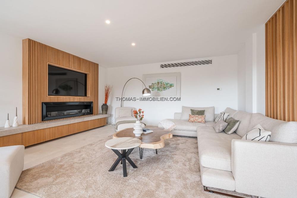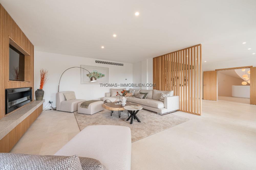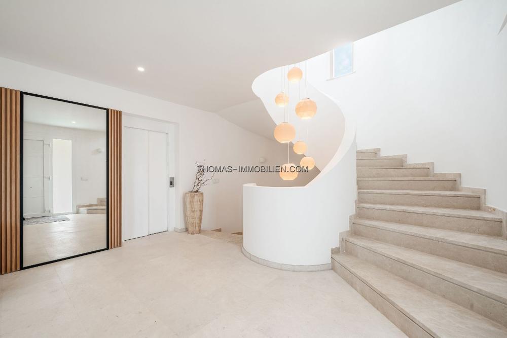 Für ein müheloses Leben konzipiert, verfügt die Villa über einen Aufzug, der alle Ebenen verbindet, offene Innenräume und mehrstöckige Terrassen, die sich perfekt zum Unterhalten eignen. Im Freien können Sie den nach Süden ausgerichteten Pool genießen oder sich auf der Dachterrasse entspannen, die mit einer Panoramalounge, einer Außenküche und mediterranen Ausblicken ausgestattet ist.