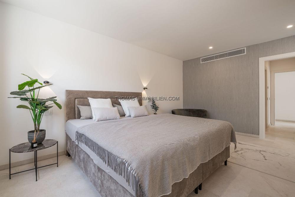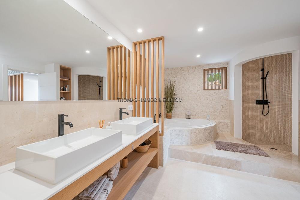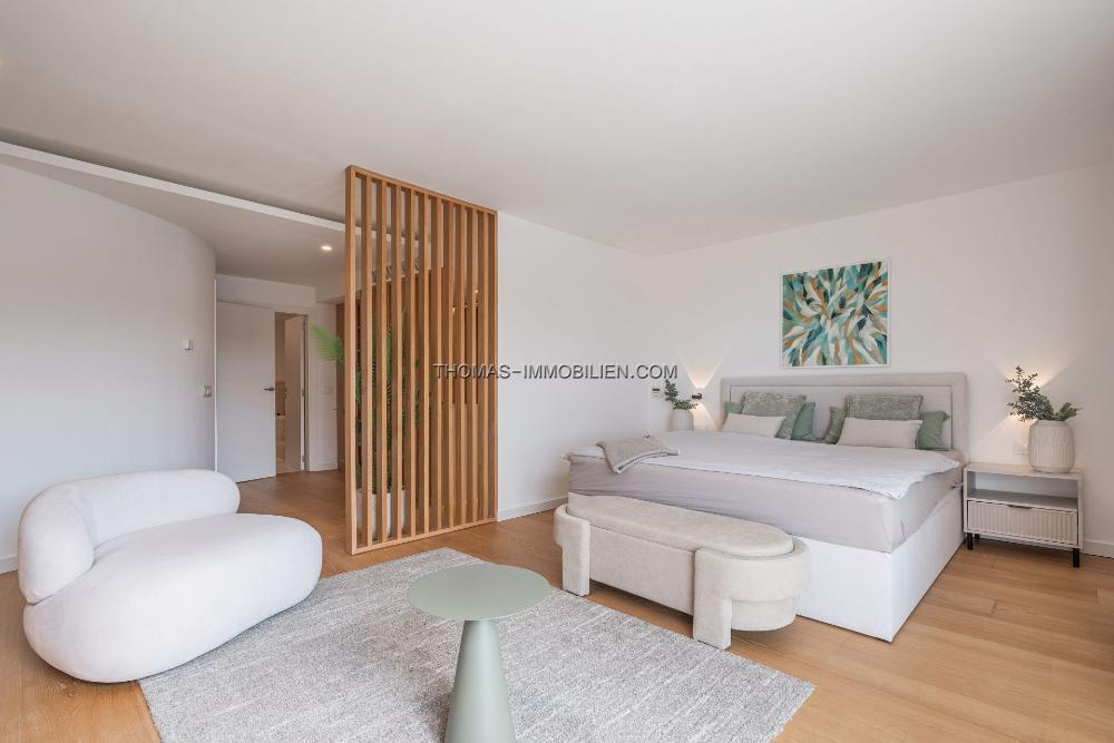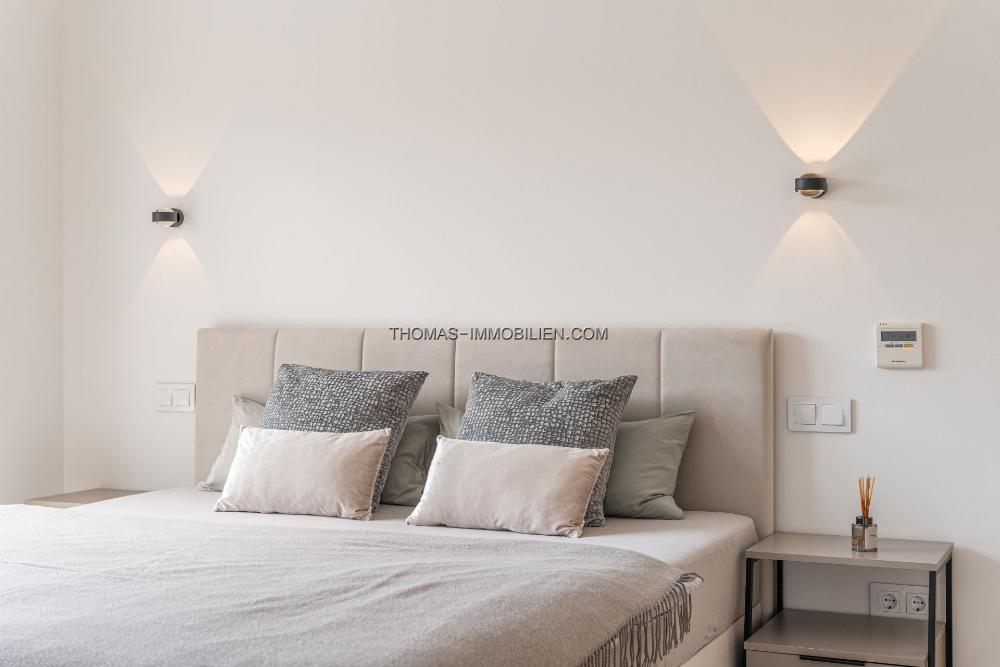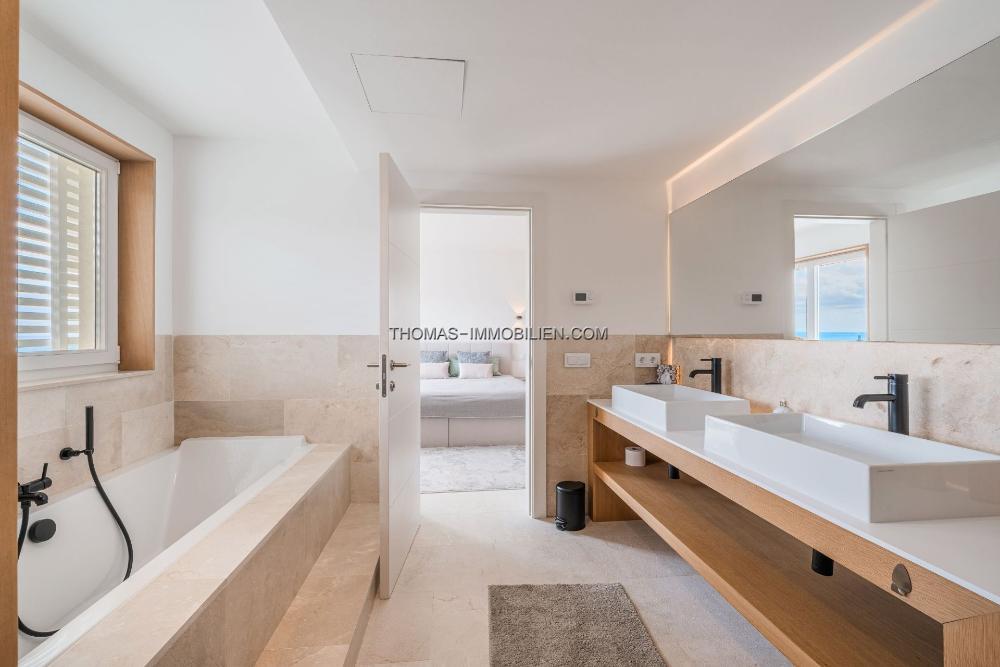 Das Innendesign kombiniert helles Holz, Naturstein und großzügige Fenster, die eine ruhige Atmosphäre schaffen, die nahtlos mit dem Meerblick verbunden ist. Die Master-Suite, mit ihrem privaten Balkon und atemberaubenden Ausblicken, dient als exklusiver Rückzugsort, ergänzt durch 3 zusätzliche Schlafzimmer und 3 Badezimmer.