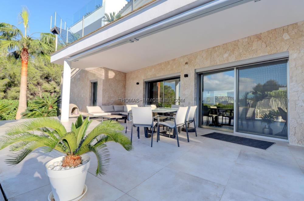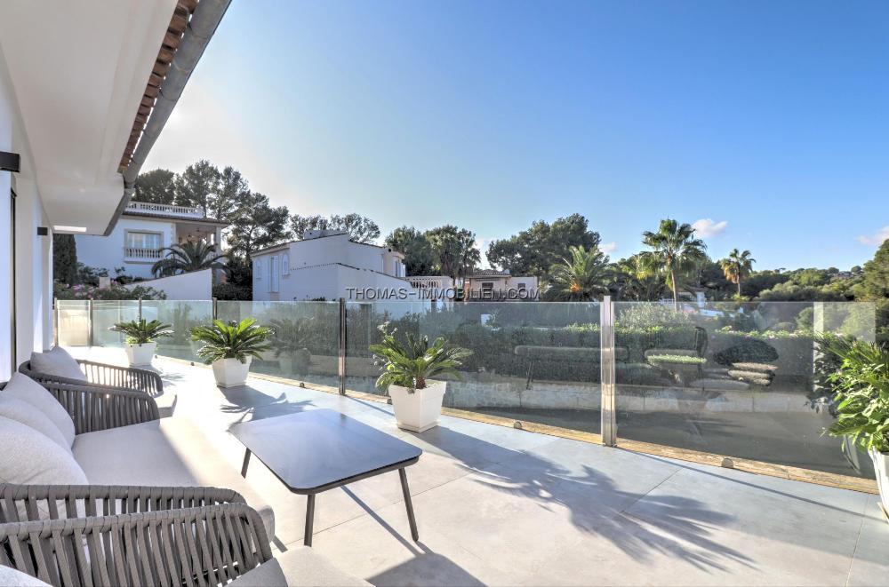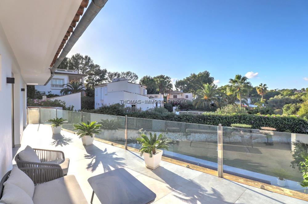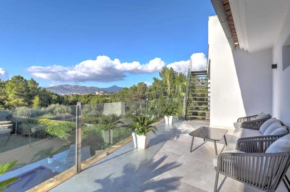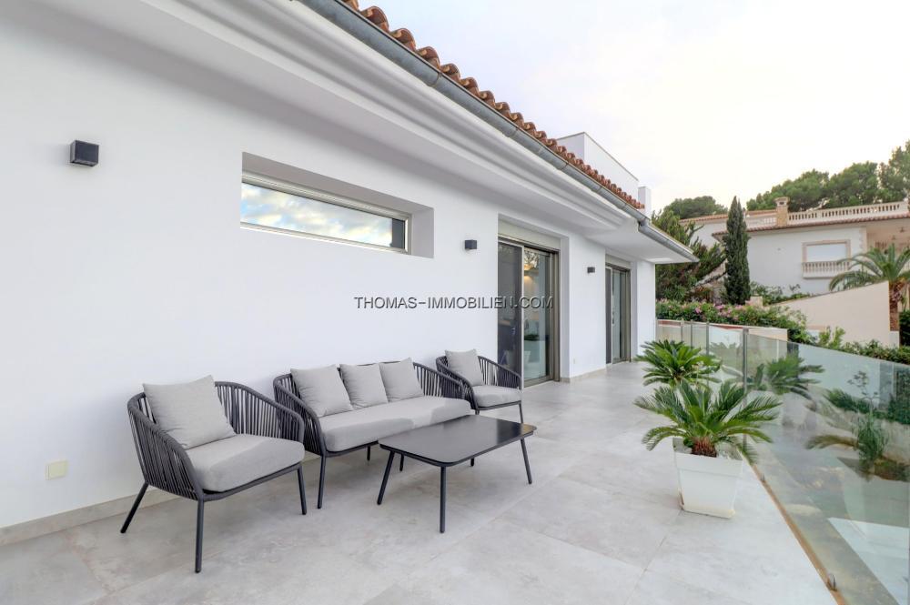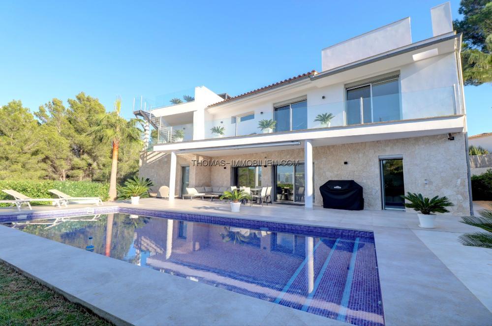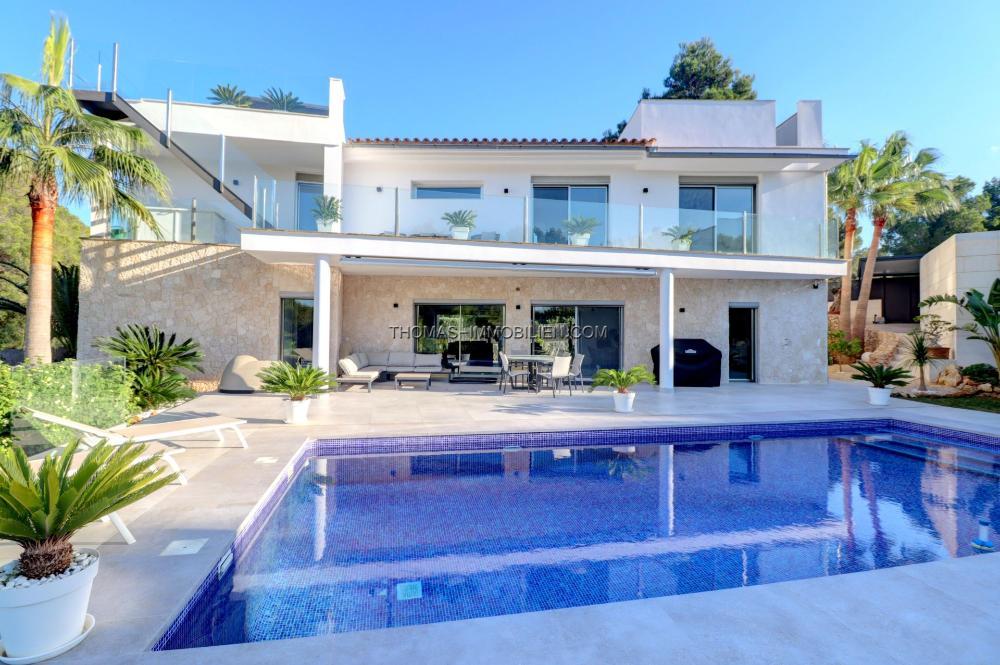 Komplett renovierte, moderne Villa mit Meerblick in Nova Santa Ponsa, direkt neben einem Grüngebiet, in ruhiger Lage und in der Nähe mehrerer Golfplätze, Tennisclubs, Strände, des luxuriösen Port Adriano und des kleinen Yachthafens von Santa Ponsa. Hochwertige Materialien und Ausstattung – Klimaanlage, elektrische Jalousien, Alarmanlage, Videokameras (alles bequem per App über Ihr Smartphone steuerbar).