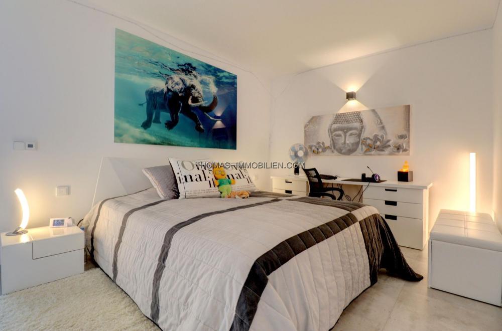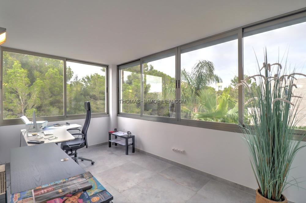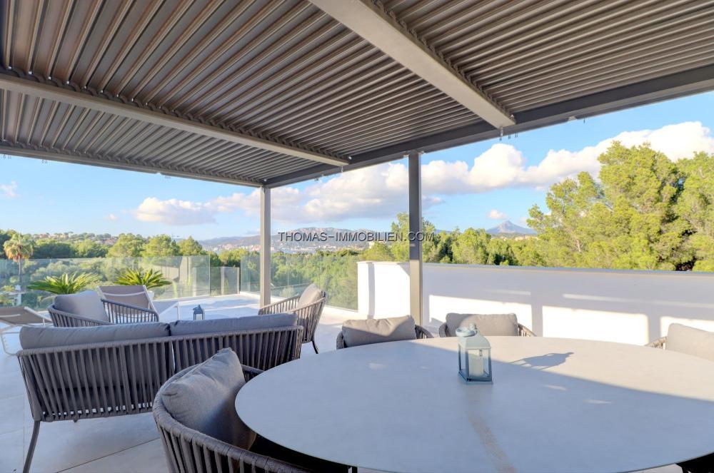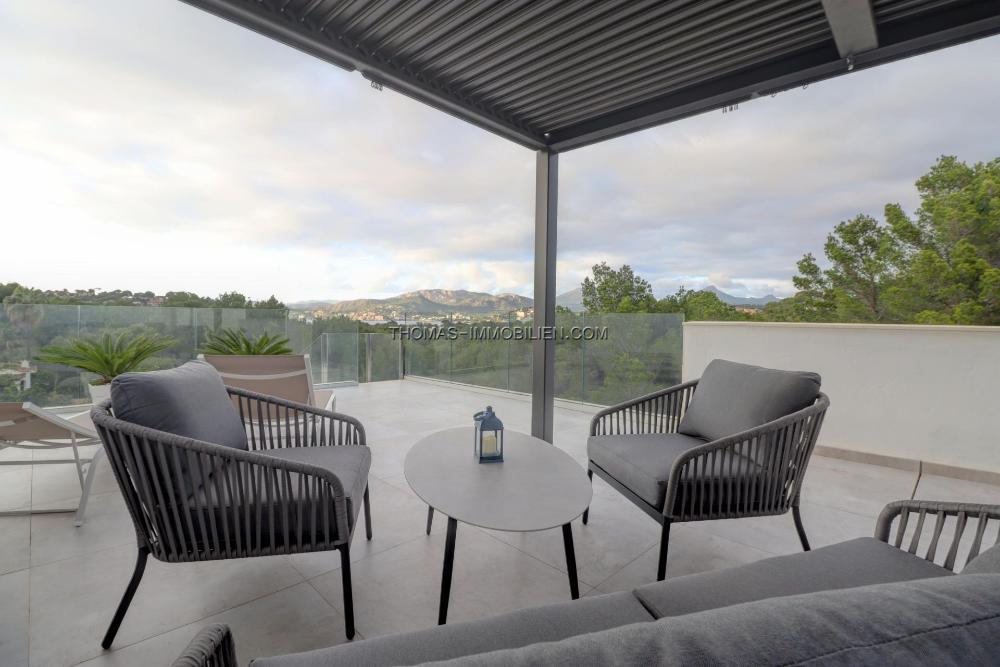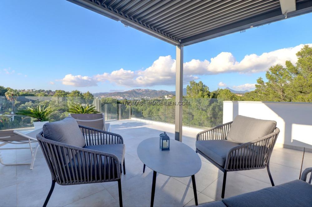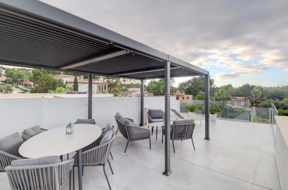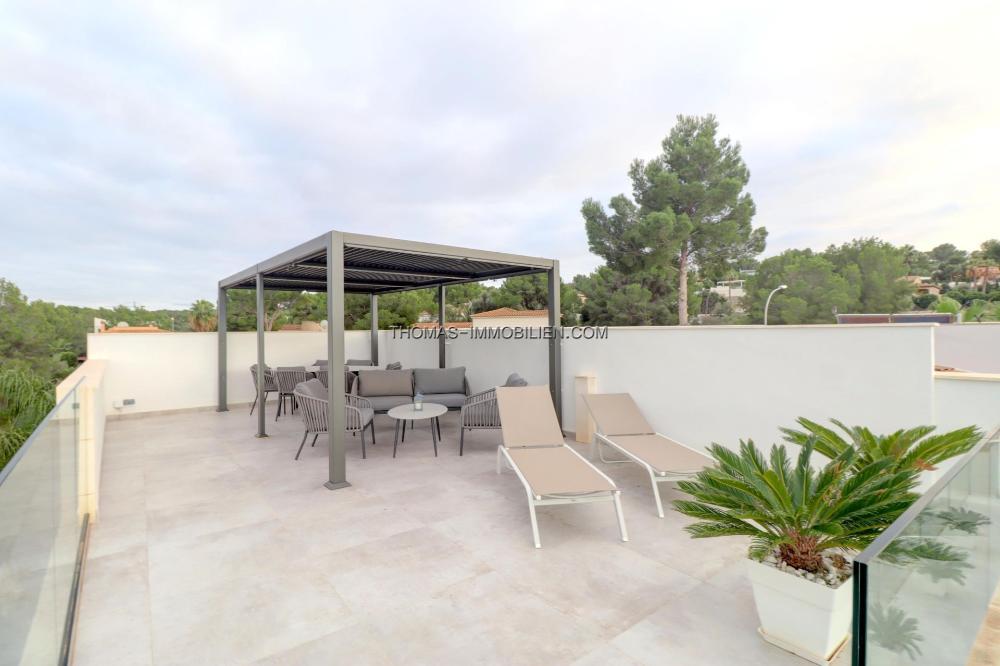 Die Wohnfläche verteilt sich auf zwei Ebenen plus Dachterrasse. Im Erdgeschoss befinden sich ein helles, offenes Wohnzimmer mit Küche, zwei Schlafzimmer und ein Gäste-WC. Von hier aus haben Sie Zugang zum Pool und den Terrassen im Erdgeschoss. Die erste Etage besteht aus einem Hauptschlafzimmer mit begehbarem Kleiderschrank und Bad en-suite, zwei Schlafzimmern mit Bad en-suite und einem Büro.Über die Terrasse der ersten Ebene gelangen Sie auf die Dachterrasse mit herrlichem Blick auf die Bucht von Santa Ponsa.