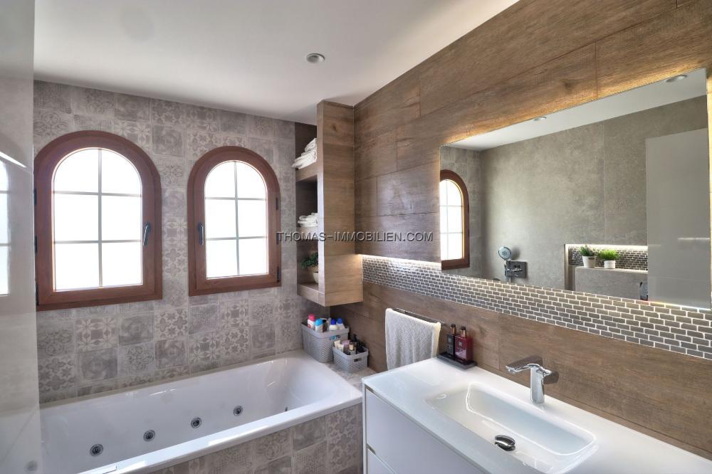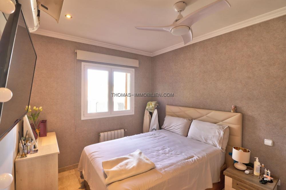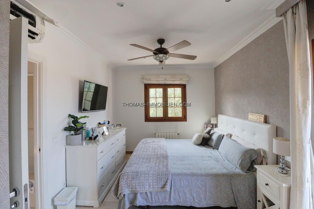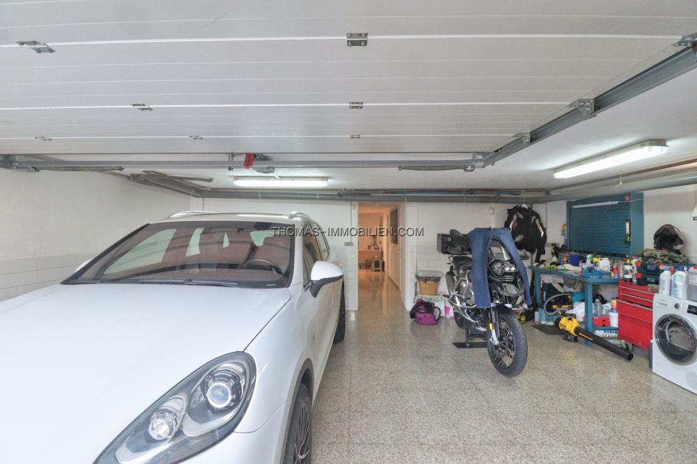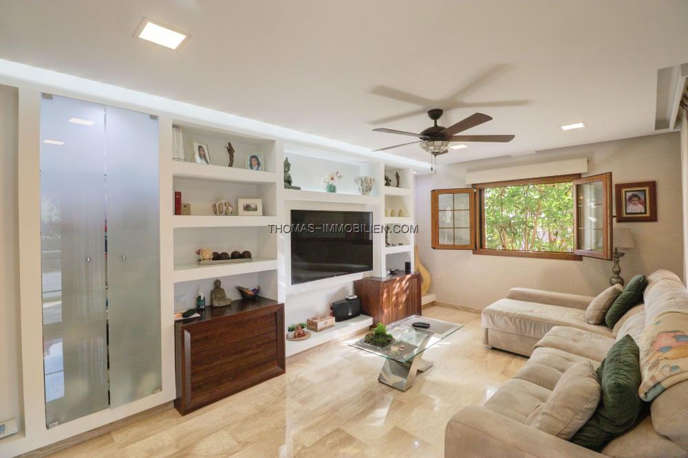 Draußen bietet die Immobilie einen privaten Swimmingpool und eine Sonnenterrasse, ideal zum Genießen des mediterranen Klimas. Die Terrasse ist von abnehmbaren Glaswänden umgeben, was Flexibilität und zusätzliche Privatsphäre bietet, während gleichzeitig eine ungehinderte Sicht ermöglicht wird. Der pflegeleichte Garten trägt zum Charme des Außenbereichs bei, ohne viel Aufwand zu erfordern. Eine Tiefgarage für zwei Autos und ein großer Abstellraum bieten reichlich Platz für die Organisation persönlicher Gegenstände.