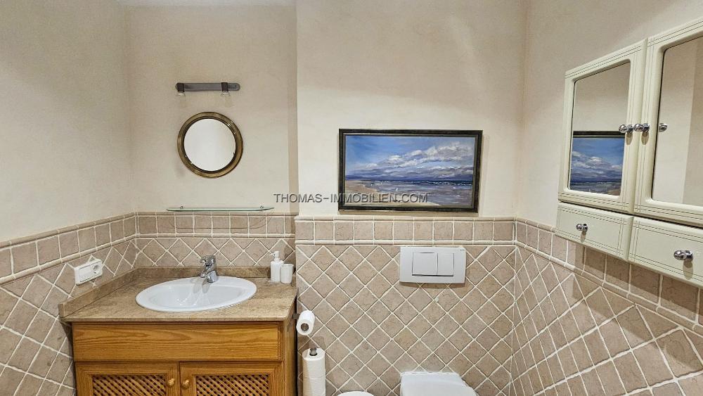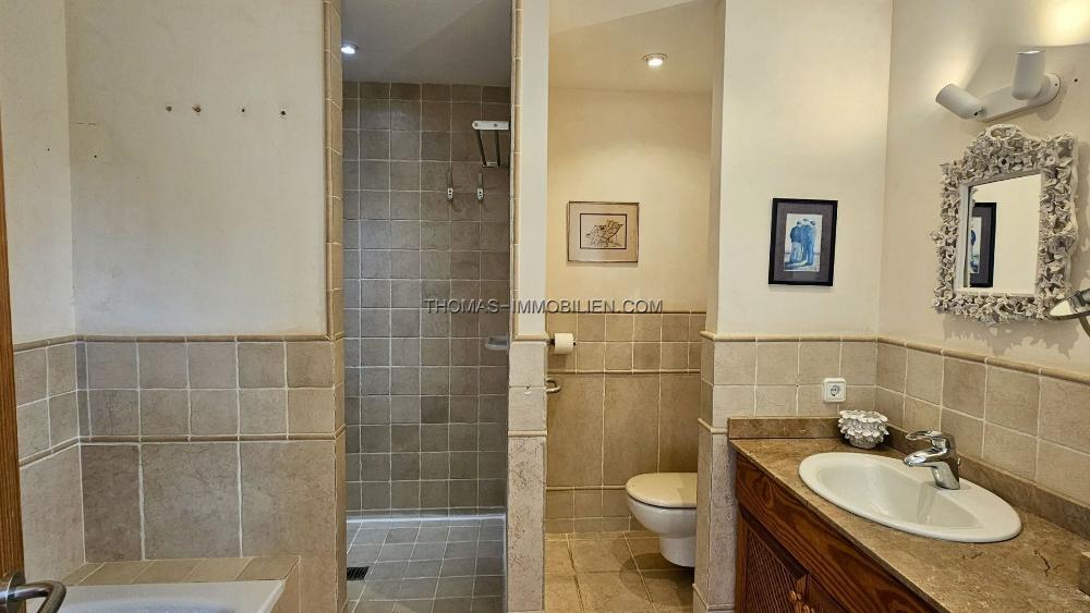 Die Wohnung verfügt über drei geräumige Doppelzimmer, die reichlich Platz für Bewohner und Gäste bieten, wobei eines dieser Schlafzimmer von der Privatsphäre eines eigenen Badezimmers profitiert. Zusätzlich gibt es zwei gut ausgestattete Badezimmer und eine separate Gästetoilette, die für Bequemlichkeit für alle sorgen.