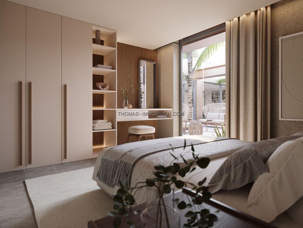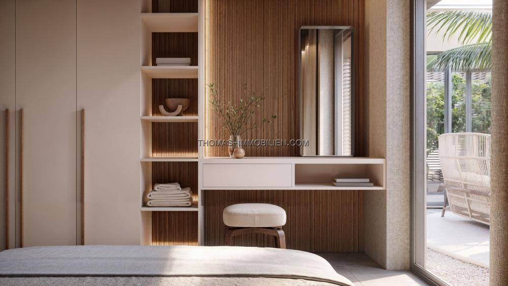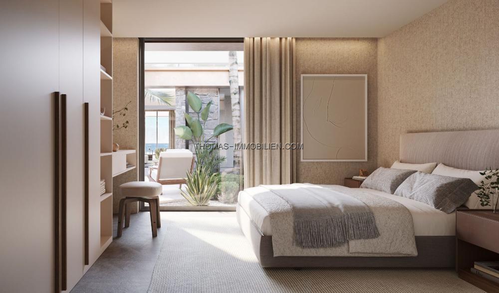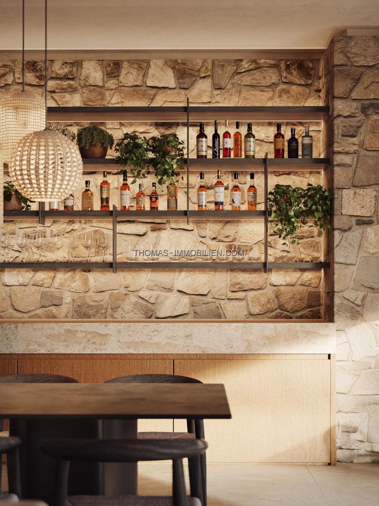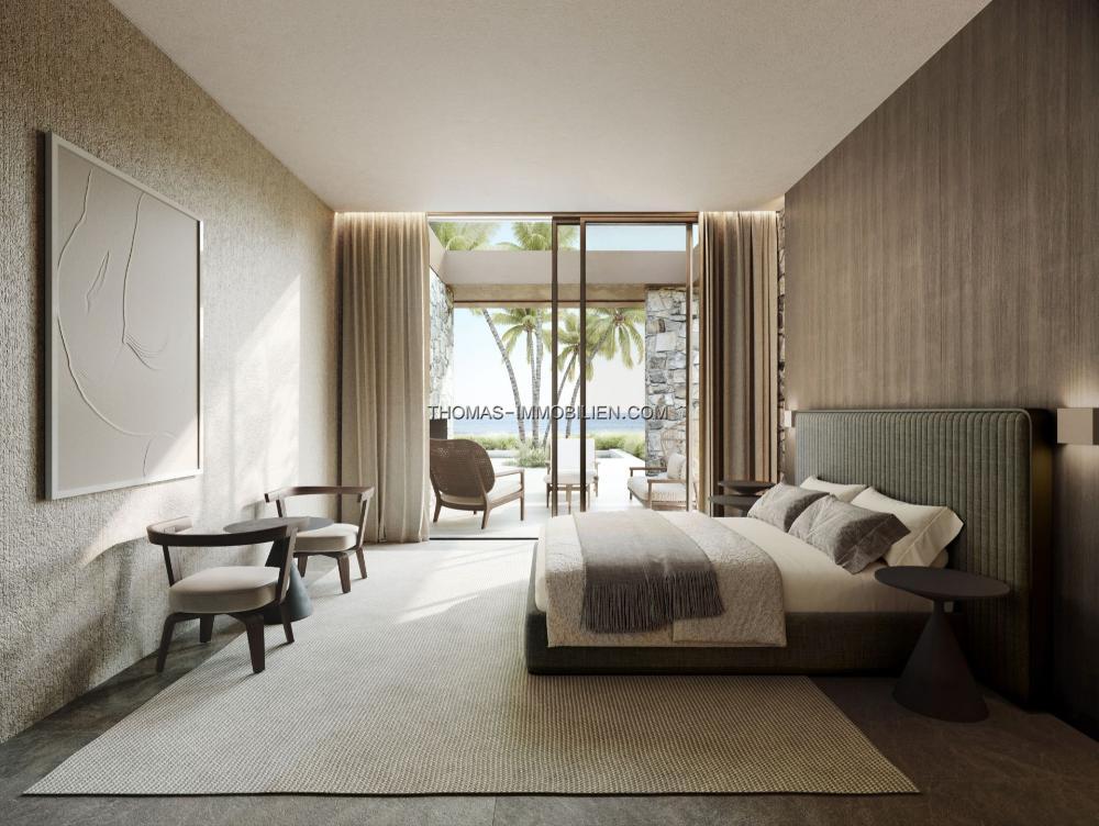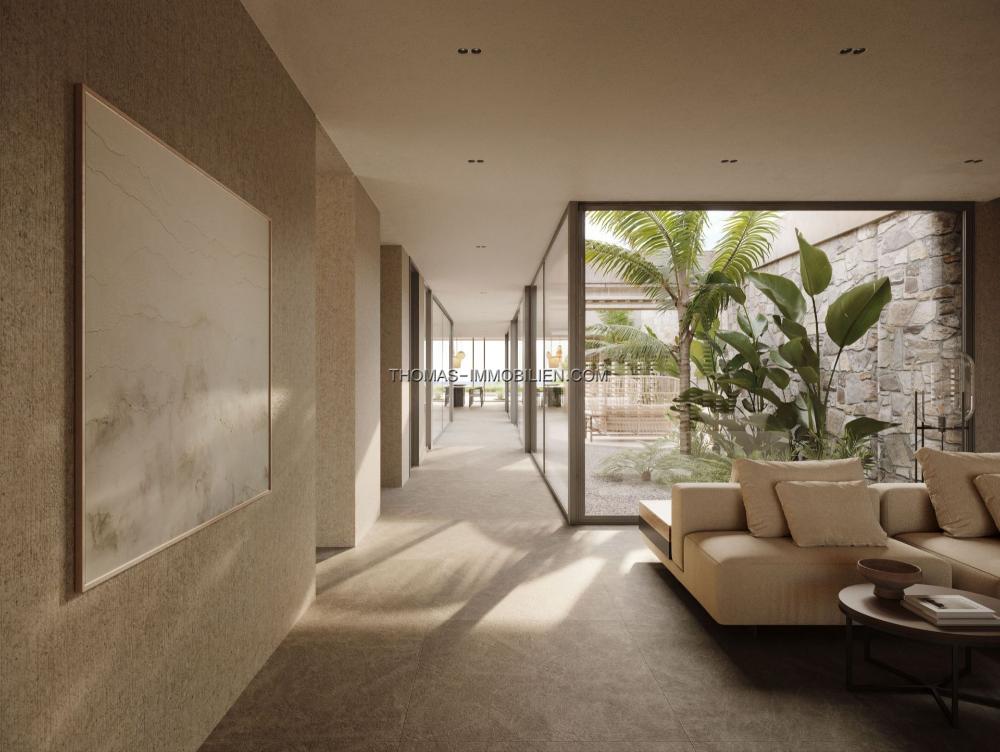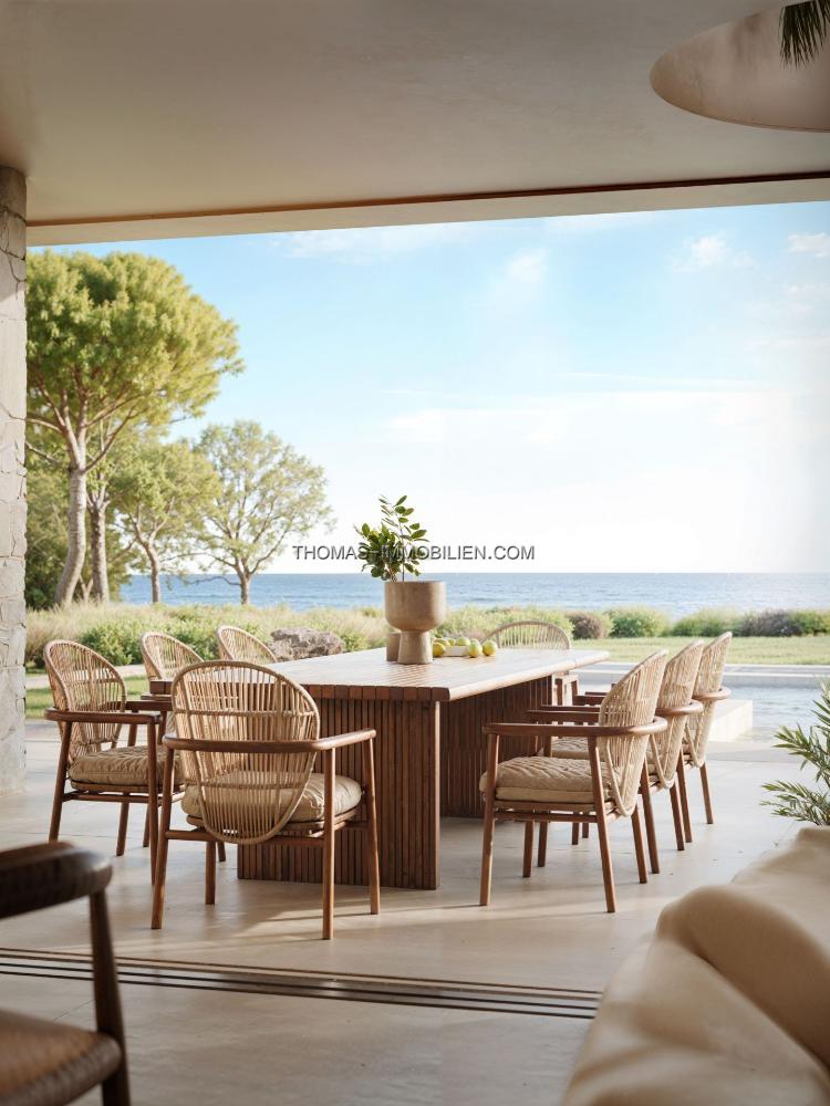 Das Innendesign integriert natürliche und erdige Farben mit dunklen Holzelementen und Natursteinelementen. Große Glastüren öffnen sich zu breiten Terrassen und tragen zum natürlichen Licht im Inneren der Immobilie bei. Der Grundriss integriert die Ess-, Wohn- und Kochbereiche in einem offenen Format.