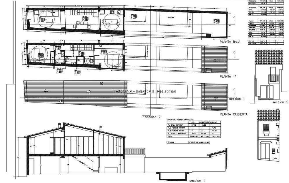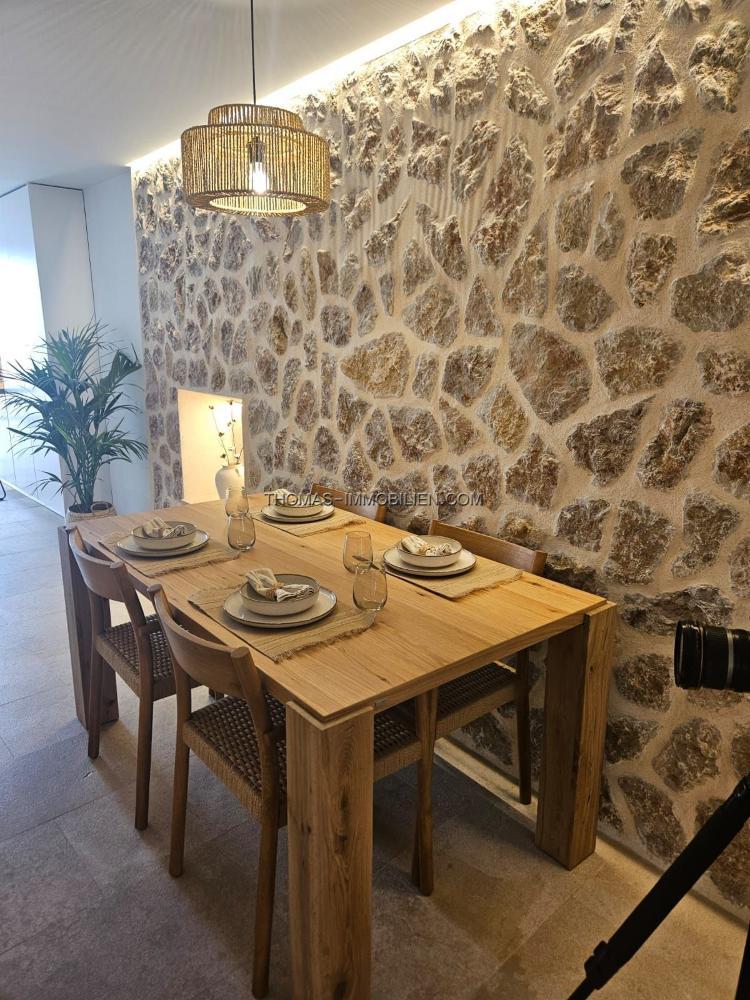 Das renovierte Layout umfasst im Erdgeschoss ein Wohnzimmer, ein Esszimmer, eine voll ausgestattete Küche und direkten Zugang zu einem schönen 50 m² großen Patio im hinteren Bereich mit einem beheizten Salzwasserpool. Im ersten Stock befinden sich zwei Schlafzimmer und zwei Badezimmer. Eines der Schlafzimmer hat eine Terrasse mit Blick auf die Tramuntana-Berge.