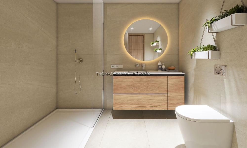 Badezimmer mit schwebenden Holzwaschtischen, begehbaren Duschen und eleganten eingebauten Armaturen der Marke Tres