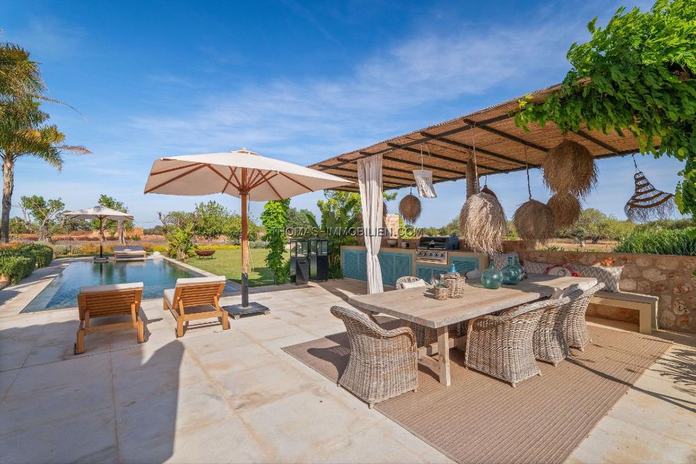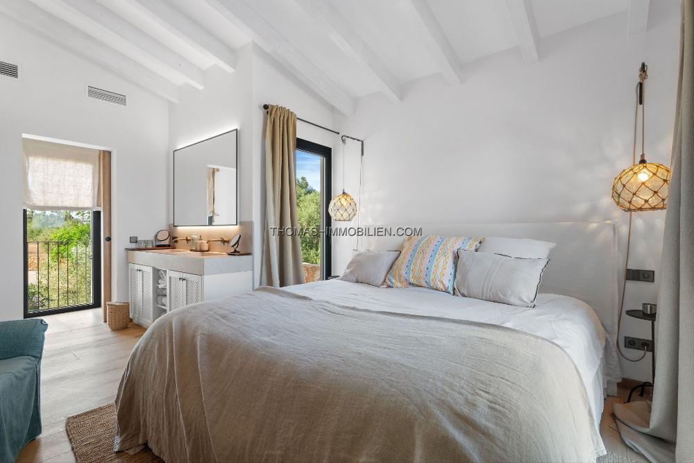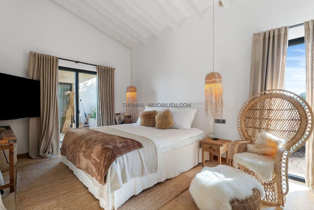 Die hochmoderne Gourmetküche verfügt über eine zentrale Insel und fließt mühelos in weitläufige Außenbereiche über - ideal für Mahlzeiten im Freien und geselliges Beisammensein unter der mallorquinischen Sonne. Die luxuriöse Master-Suite ist ein privates Refugium mit begehbarem Kleiderschrank, einem von einem Spa inspirierten Badezimmer und einer ruhigen Außendusche, umgeben von Natur. Im Obergeschoss genießen die Gäste-Master-Suiten jeweils eigene private Balkone mit ruhigem Blick über das Anwesen und die umliegende Landschaft.