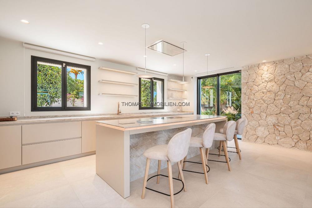 Die Villa wurde mit den modernsten und energieeffizientesten Technologien neu gebaut. Dazu gehören ein Smart-Home-Steuerungssystem, eine moderne Luft-Wasser-Wärmepumpe, individuell steuerbare Fußbodenheizung, eine leistungsstarke Klimaanlage, ein beheizbarer Salzwasserpool mit Solarabdeckung und ein umfangreiches Photovoltaiksystem, das den Großteil des Energiebedarfs der Villa abdeckt. Die Verwendung hochwertiger Materialien wie Naturstein und Eichenparkettböden sowie eine luxuriöse Designerküche von Espacio mit Geräten von Gaggenau unterstreichen die Exklusivität dieser Immobilie.