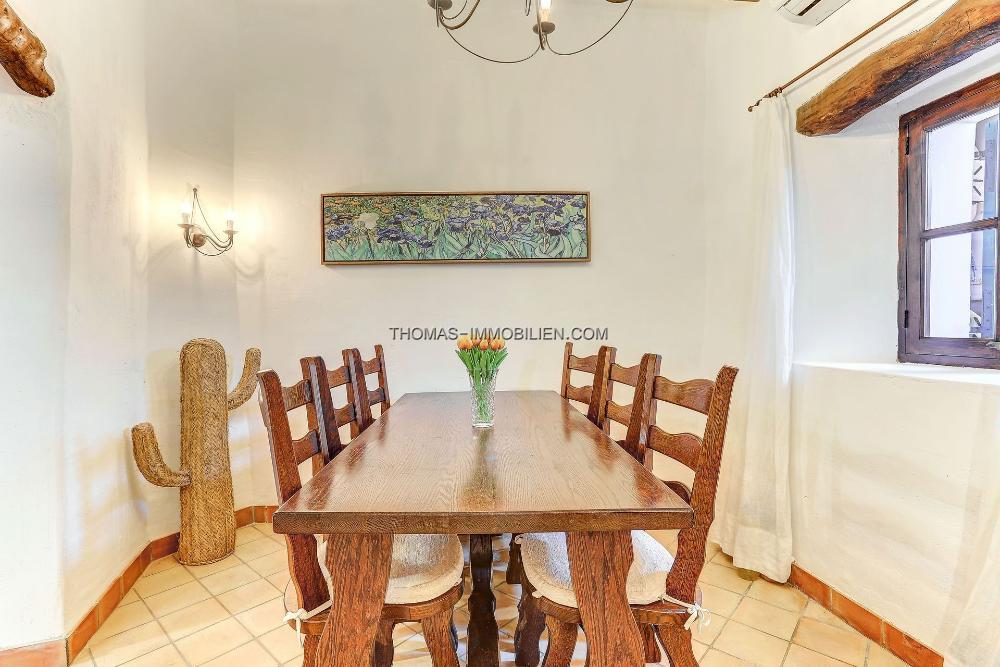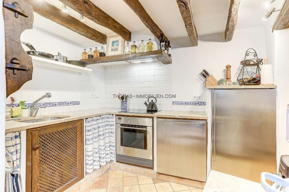 Die Immobilie hat eine bebaute Fläche von 122 m² und verfügt über zwei Schlafzimmer und zwei Badezimmer. Das Erdgeschoss bietet offenes Wohnen mit einem gemütlichen Wohnzimmer, einem Essbereich und einer voll ausgestatteten Küche. Traditionelle Details, darunter freiliegende Balken, Steinwände und ein Kamin, wurden sorgfältig erhalten, während die Küche auf moderne Standards aktualisiert wurde. Ein Gäste-WC und eine Waschküche vervollständigen diese Ebene.