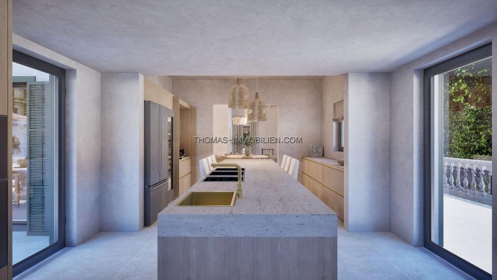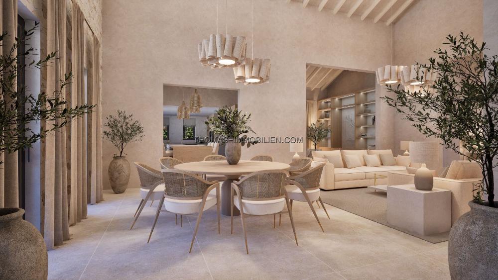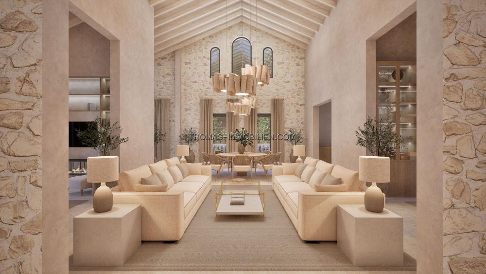 Die maßgeschneiderte Küche ist mit hochwertigen Geräten ausgestattet und für Unterhaltung konzipiert, sie öffnet sich direkt zu 285 m² Terrassen und dem 10-Meter-Infinity-Pool. Die Hauptess- und Wohnbereiche genießen hohe gewölbte Decken mit freiliegendem Mauerwerk, während eine zweite gemütliche Lounge mit einem doppelseitigen Kamin einen intimen Rückzugsort bietet.