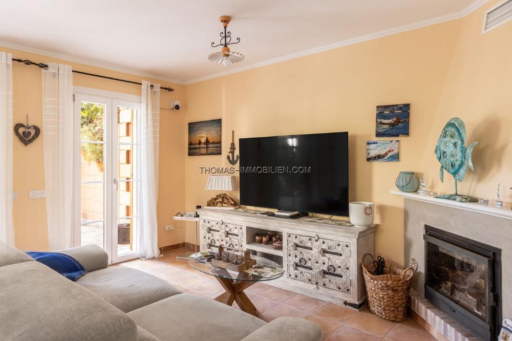 Das Innere ist durchdacht auf zwei Etagen aufgeteilt. Die Hauptetage verfügt über ein helles, offenes Wohn-/Esszimmer, das durch einen gemütlichen Kamin hervorgehoben wird und eine einladende Atmosphäre schafft. Dieser Raum fließt nahtlos auf eine private Terrasse und einen schönen privaten Gartenbereich, der nur wenige Schritte vom prächtigen Gemeinschaftspool entfernt ist. Auf dieser Etage befinden sich auch eine voll ausgestattete Küche und ein praktisches Duschbad.