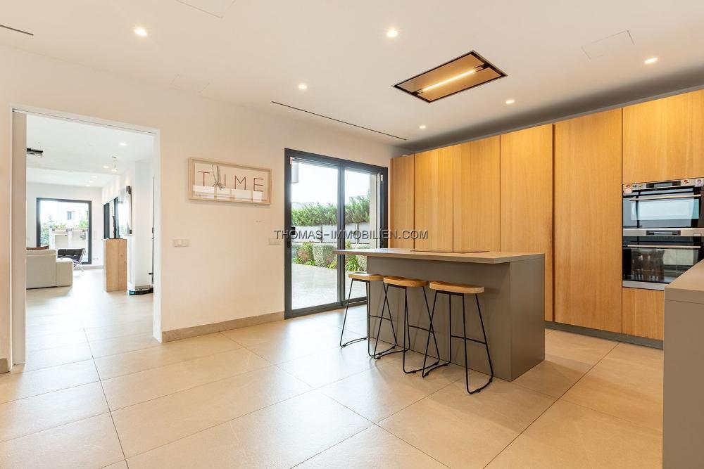 Im Erdgeschoss fließt das offene Layout nahtlos zwischen der Designer-Küche, dem Essbereich und dem lichtdurchfluteten Wohnbereich – alle öffnen sich zu den Garten- und Poolterrassen. Zwei Gästezimmer und ein gemeinsames Badezimmer vervollständigen diese Ebene.