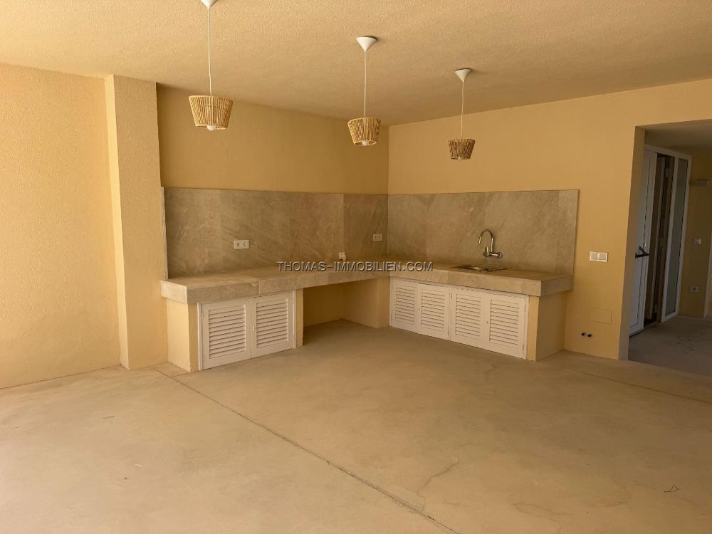 Der Eingang öffnet sich zu einem hellen Flur mit einer großen Treppe, die zum Hauptwohnbereich führt. Hier fließen eine offene Küche, ein Ess- und Wohnbereich natürlich auf eine große sonnige Terrasse, ideal zum Unterhalten oder um das mediterrane Klima das ganze Jahr über zu genießen.