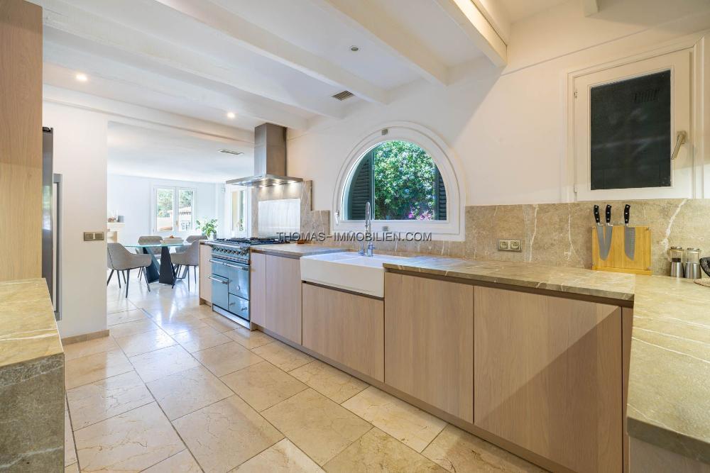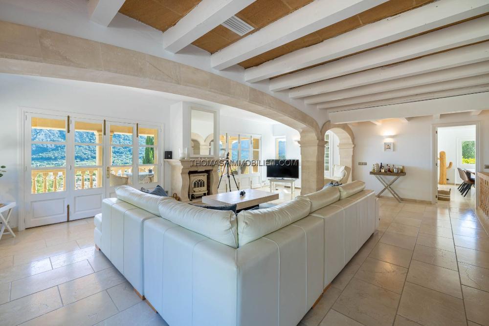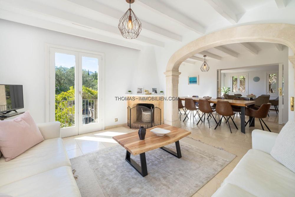 Im Inneren präsentiert sich das Haus geschmackvoll modernisiert und vereint klassische mallorquinische Elemente wie Holzbalken und Marmorböden mit einem hellen, zeitgemäßen Interieur. Die komplett renovierte Küche verfügt über Steinarbeitsplatten, einen Gasherd, einen Elektroherd und einen Frühstücksbereich. Ein Bogengang führt in ein geräumiges Esszimmer mit freiem Blick auf die Berge. Vom Esszimmer gelangt man in eine gemütliche Leseecke, während sich links ein großzügiges Wohnzimmer mit Kamin und direktem Zugang zu einer großen Terrasse mit atemberaubendem Blick auf den Puig de Maria und die umliegende Landschaft befindet.