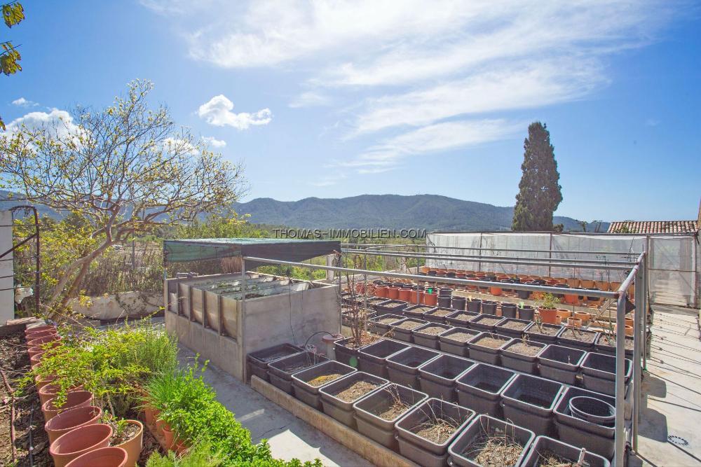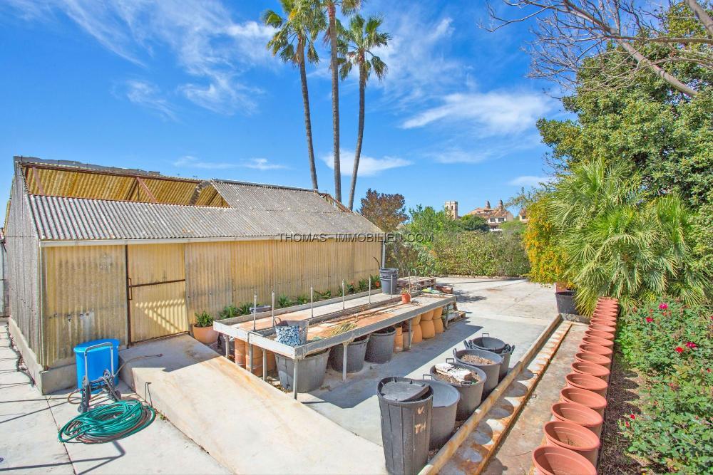 Im hinteren Teil des Grundstücks befinden sich zentral zwei große Lagergebäude. Dahinter liegt ein beträchtlicher Außenbereich, der derzeit für landwirtschaftliche Zwecke genutzt wird und ein großzügig dimensioniertes Gewächshaus umfasst.