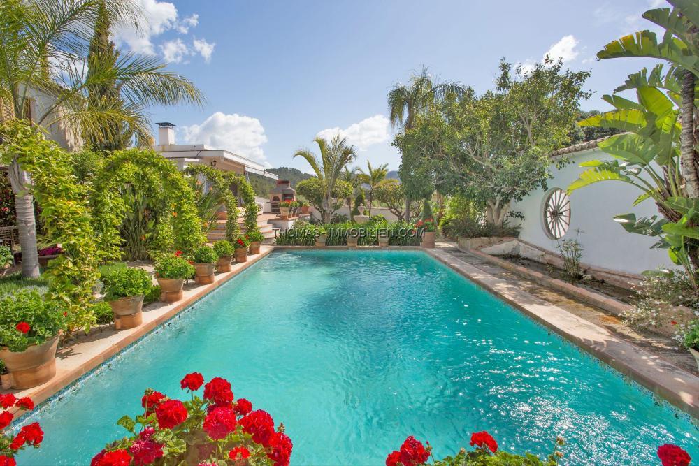 Der Außenbereich sticht als echtes Highlight hervor. Der Poolbereich ist von gepflegtem Grün umgeben und bietet einen weiten, klaren Blick auf die Berge, was zusammen eine private Oase der Ruhe und Stille bildet.