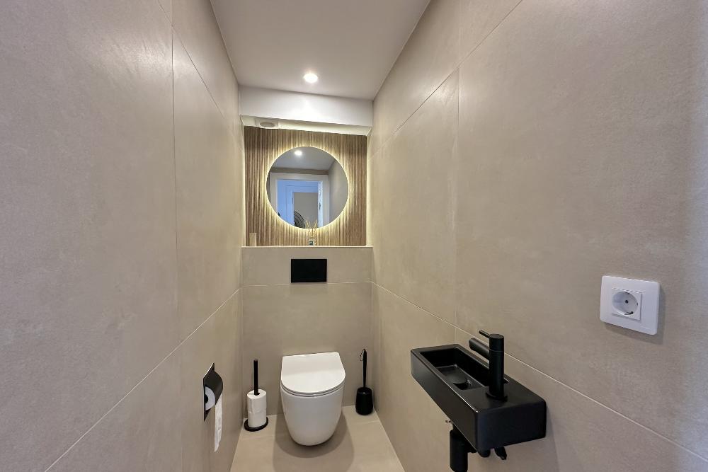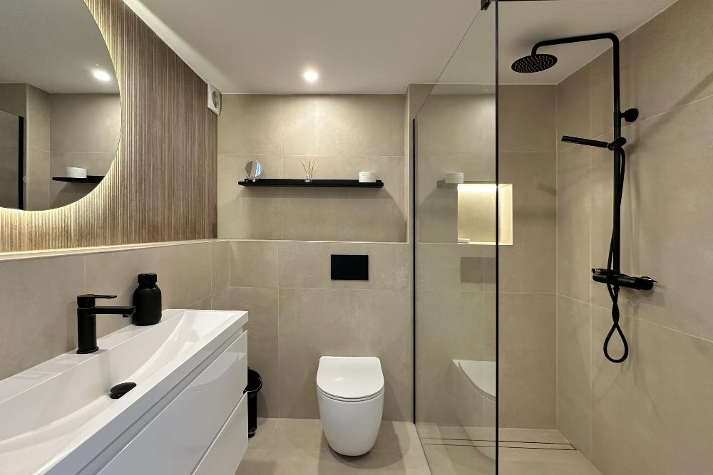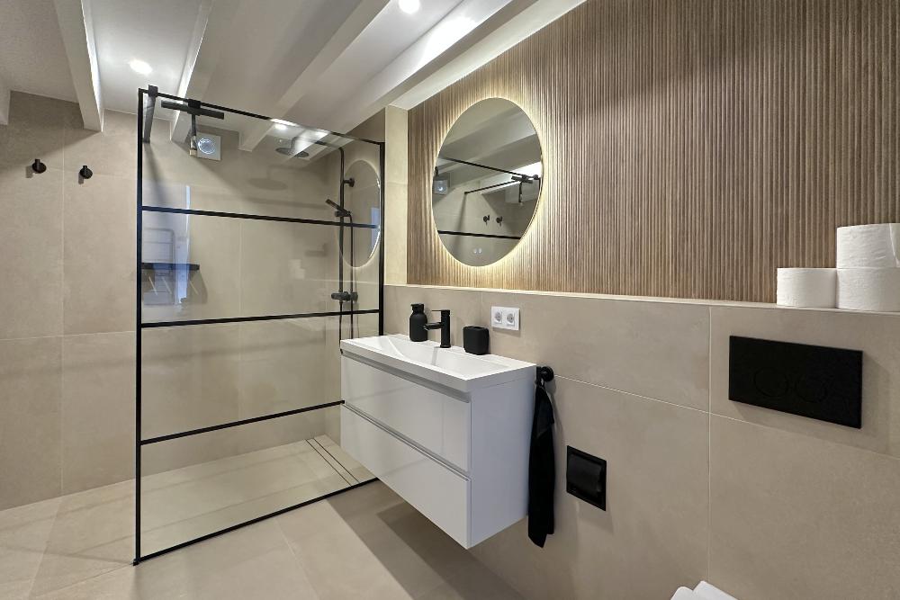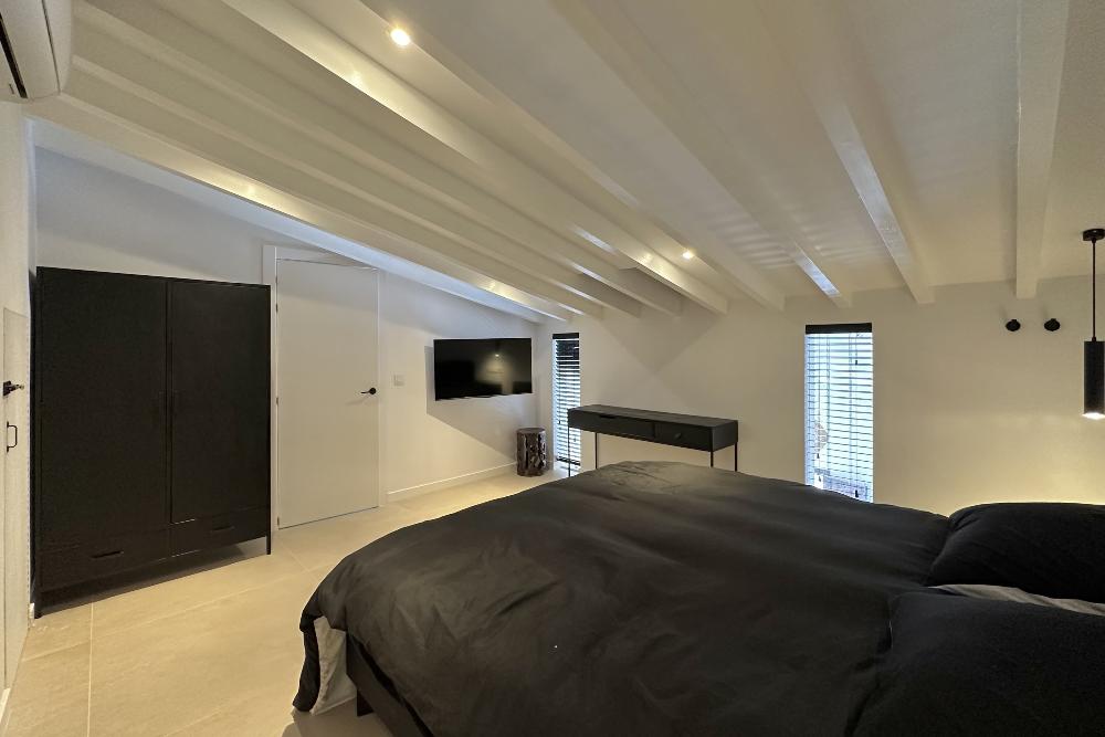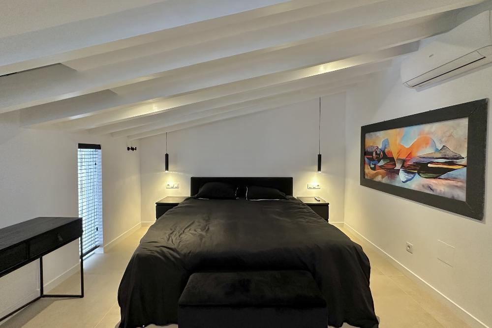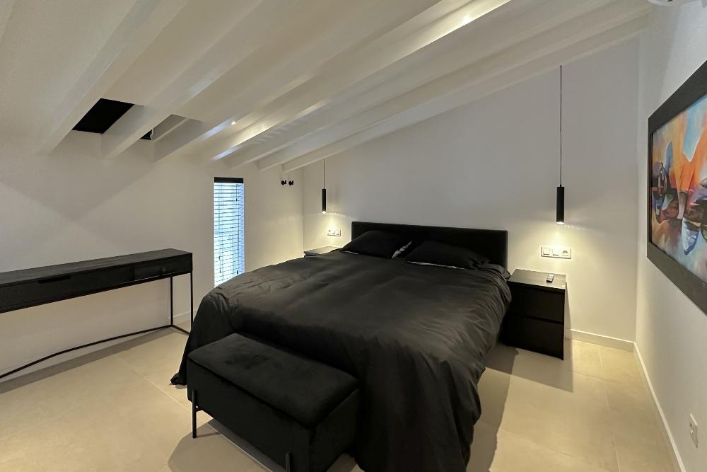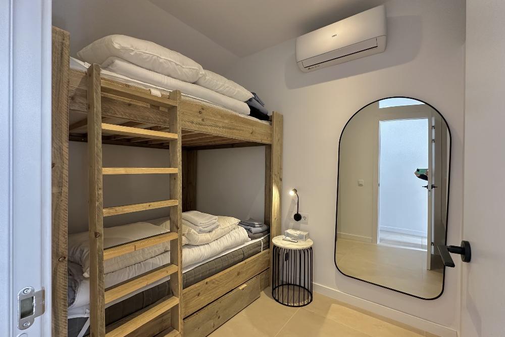 Die moderne Immobilie erstreckt sich über zwei Etagen und bietet vier Schlafzimmer (3 Doppelbetten, 1 Etagenbett), zwei Badezimmer sowie ein zusätzliches Gäste-WC. Alle Schlafzimmer sind mit Klimaanlage ausgestattet. Die voll eingerichtete Küche verfügt über Backofen, Geschirrspüler, Kühlschrank und Gefrierfach. Waschmaschine und Staubsauger sind ebenfalls vorhanden. Ein besonderes Highlight ist die private Dachterrasse.