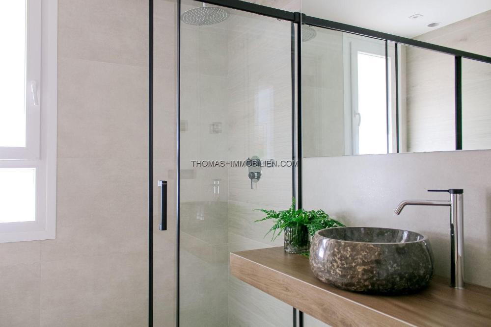 Erdgeschoss. Helles, offenes Wohn- und Esszimmer, verbunden mit einer möblierten Küche. Große Schiebetüren mit direktem Zugang zum Garten und zum privaten Swimmingpool. Zwei geräumige Schlafzimmer mit Einbauschränken.