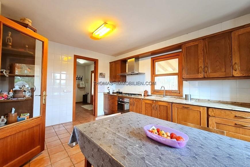 Sie besteht aus Erdgeschoss und erstem Stock. Im Erdgeschoss befinden sich ein geräumiges Wohn-Esszimmer mit Kamin und Zugang zur VerandaTerrasse, eine voll ausgestattete unabhängige Küche, zwei große Doppelschlafzimmer mit Einbauschränken und ein komplettes Badezimmer. Im Obergeschoss befindet sich ein ca. 50 m² großer, heller Raum, der sich ideal für eine Master-Suite eignet, mit Vorinstallation für ein Badezimmer, Platz für ein Ankleidezimmer und einer Sonnenterrasse mit freiem Blick auf die Serra de Tramuntana. Großer KellerGarage mit Hauswirtschaftsraum. Im Außenbereich befinden sich ein großes, umzäuntes Grundstück und zwei überdachte Terrassen.