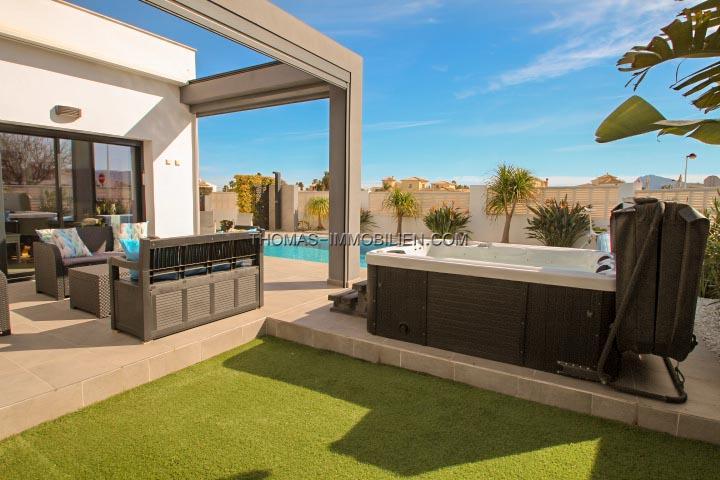 Im Garten, der wenig Wartung benötigt, haben wir einen 8X4-Pool mit Solarheizung und Außendusche, einen Whirlpool, einen Fußgängereingang mit Gegensprechanlage, eine Pergola von 19 m², um das Auto mit Zugang mit einer Schiebetür mit Motor zu parken, einige Bäume einschließlich Obstbäume.