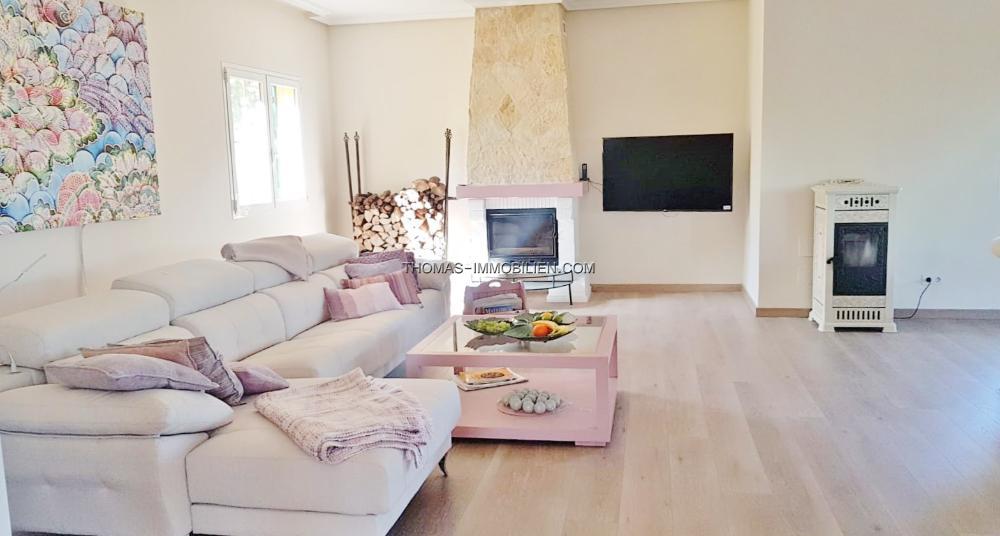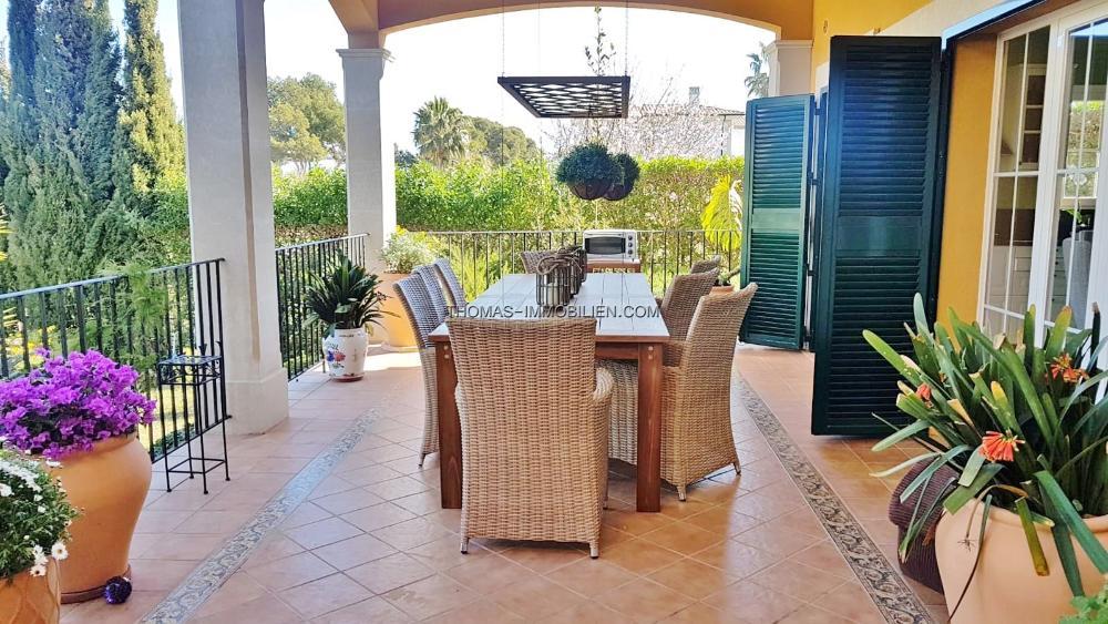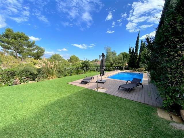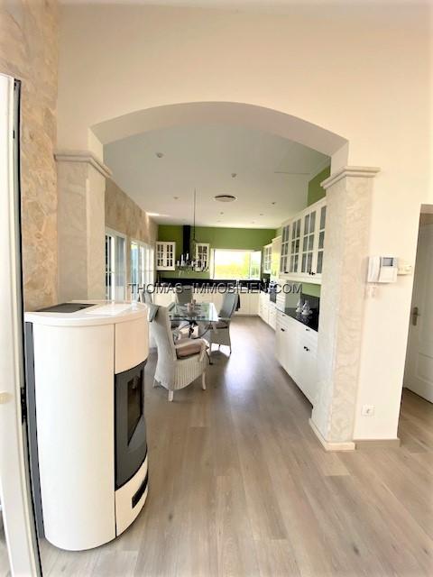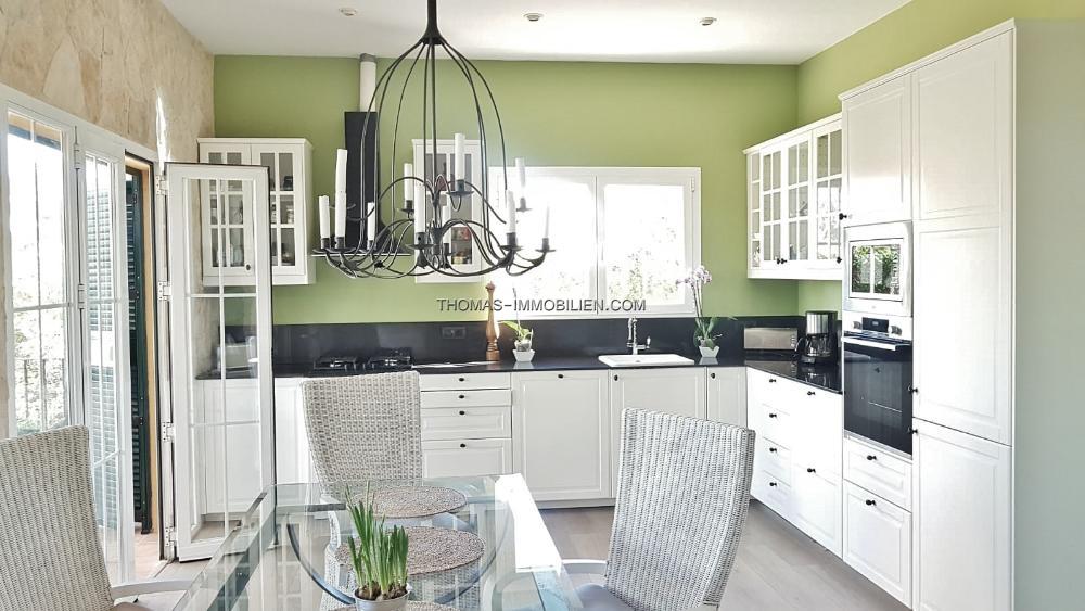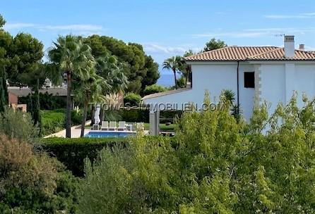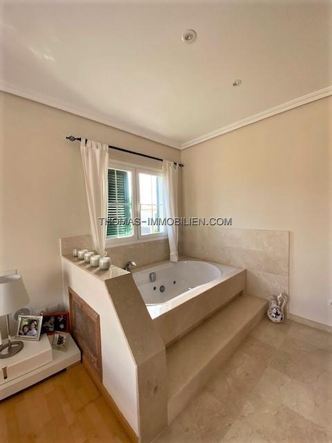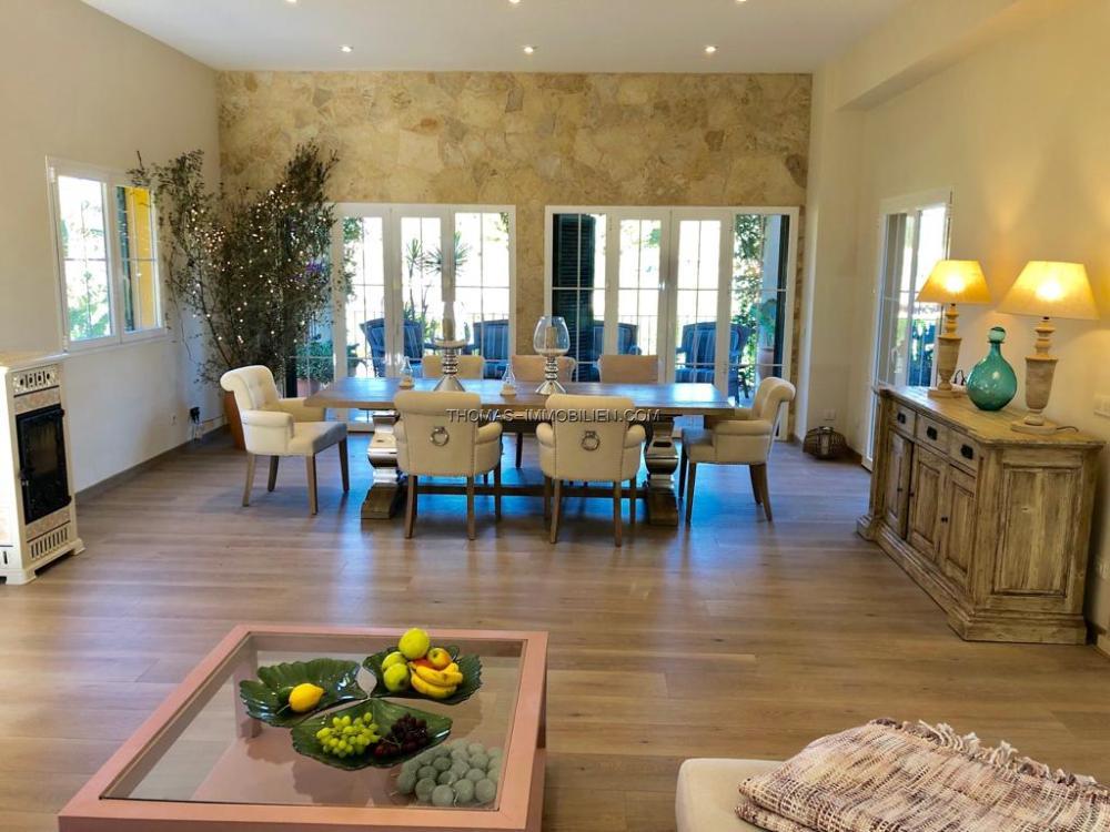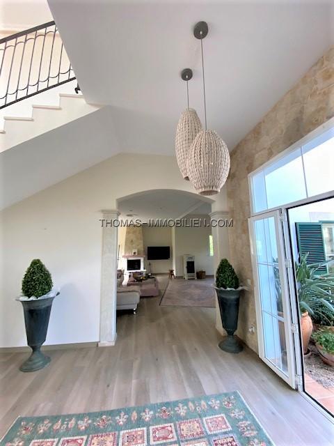 Diese wunderschöne Villa befindet sich einer sehr gepflegten, ruhigen und gesicherten Einzelvillen-Wohnanlage in Cala Vinyes. Sie wurde mit viel Liebe zum Detail und Geschmack eingerichtet. Der Boden ist mit hochertigem Laminat in allen Wohnräumen ausgelegt. Für Wärme sorgt ein grosser Pelletofen. Von der imposanten Eingangstür gelangt man in einen grossen hellen Vorraum mit Blick auf den wunderschönen Garten und Pool. Für viel Platz sorgt eine Doppelgarage, sowie ein separater Abstellraum und Gäste -WC. Rechts davon befindet sich die offene Küche mit gemütlichen Essbereich und Zutritt zur schönen Terrasse, Garten und Pool. Die Küche ist komplett neu und mit hochwertigen Geräten ausgestattet. Gegenüber ist der wunderschöne , großzügige Wohn-und Essbereich mit Kamin und bodentiefen Fenstern mit Blick ins Grüne. Das Obergeschoss ist aufgeteilt in 3 Schlafzimmer mit Bad ensuite. Von jedem Zimmer gelangt man auf eine Terrasse und Balkon. Im Masterschlafzimmer gibt e sauch einen Jacuzzi.Von 2 Terrassen hat man Meerblick.