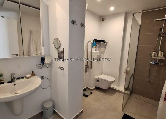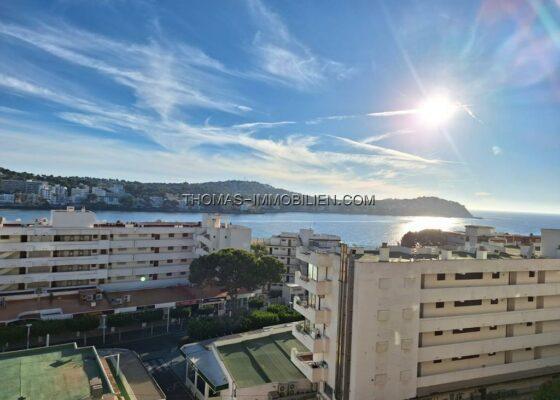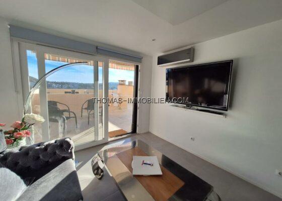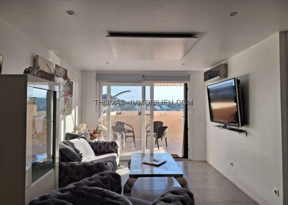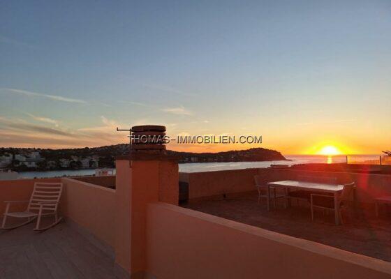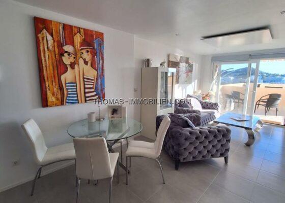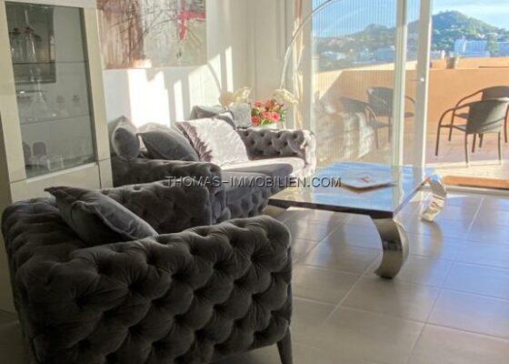 Schoenes Meerblick Apartment mit einer privaten Terrasse von 56 Quadratmeter. Das Apartment verfuegt ueber Klimaanlage und Infrarotheizung. In jedem Zimmer befinden sich Moskitonetze. Im Gebaeude ist ein Lift vohanden. Fusslaeufig in wenigen Minuten ist der Strand erreichbar sowie alle Annehmlichkeiten vom Zentrum in Santa Ponsa.
