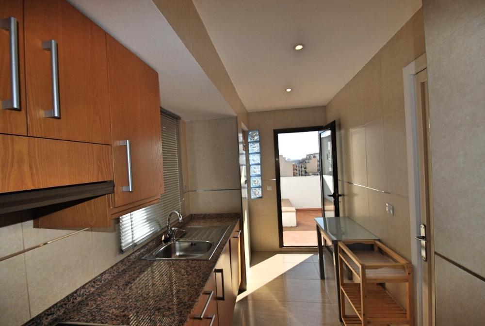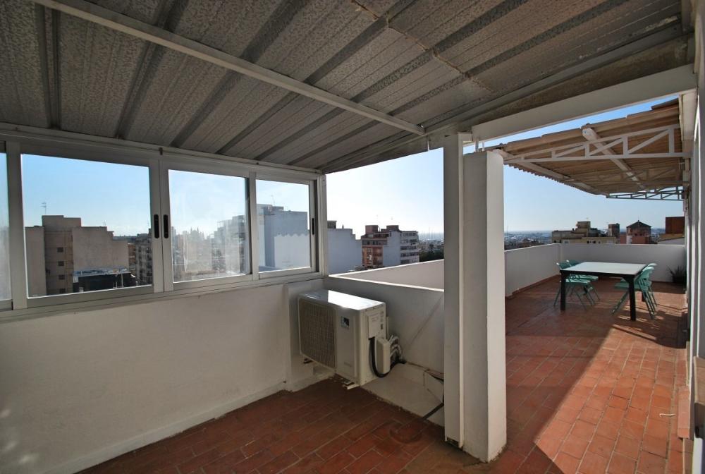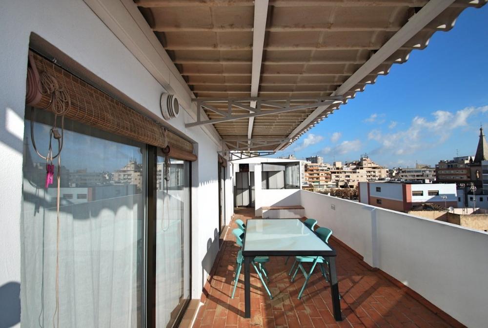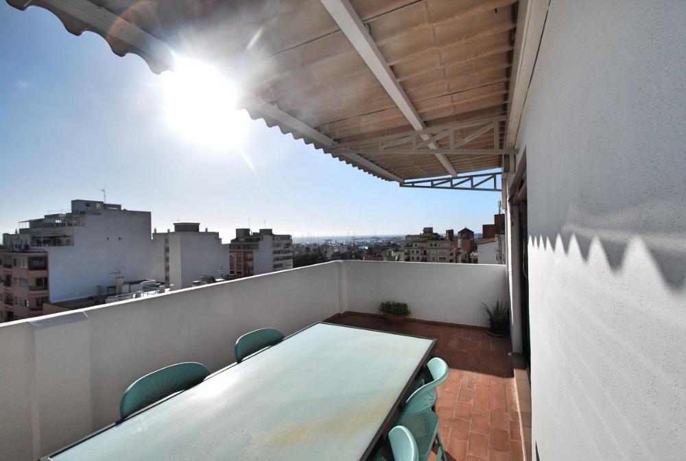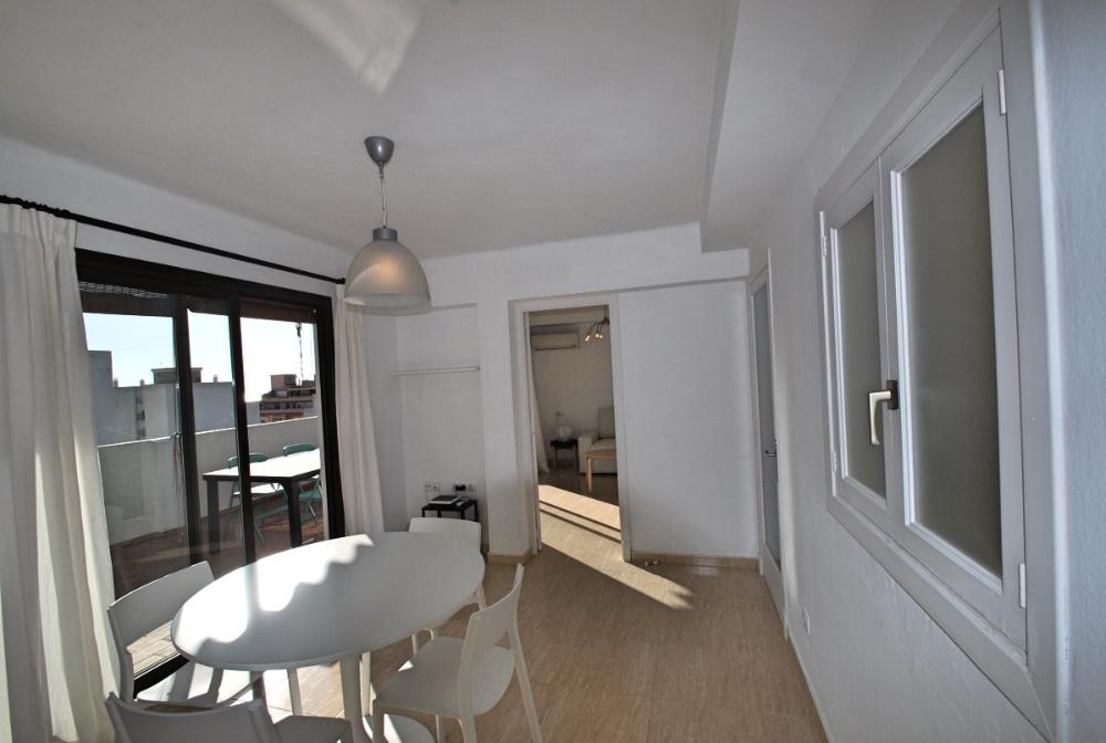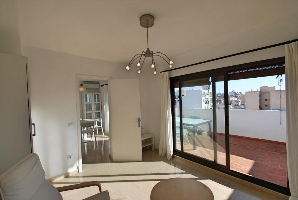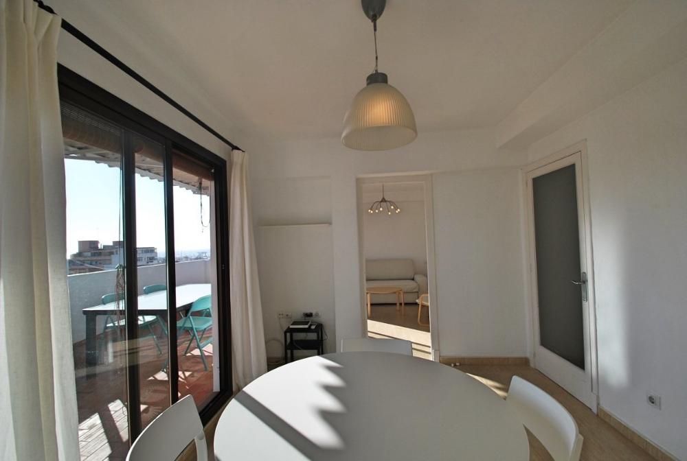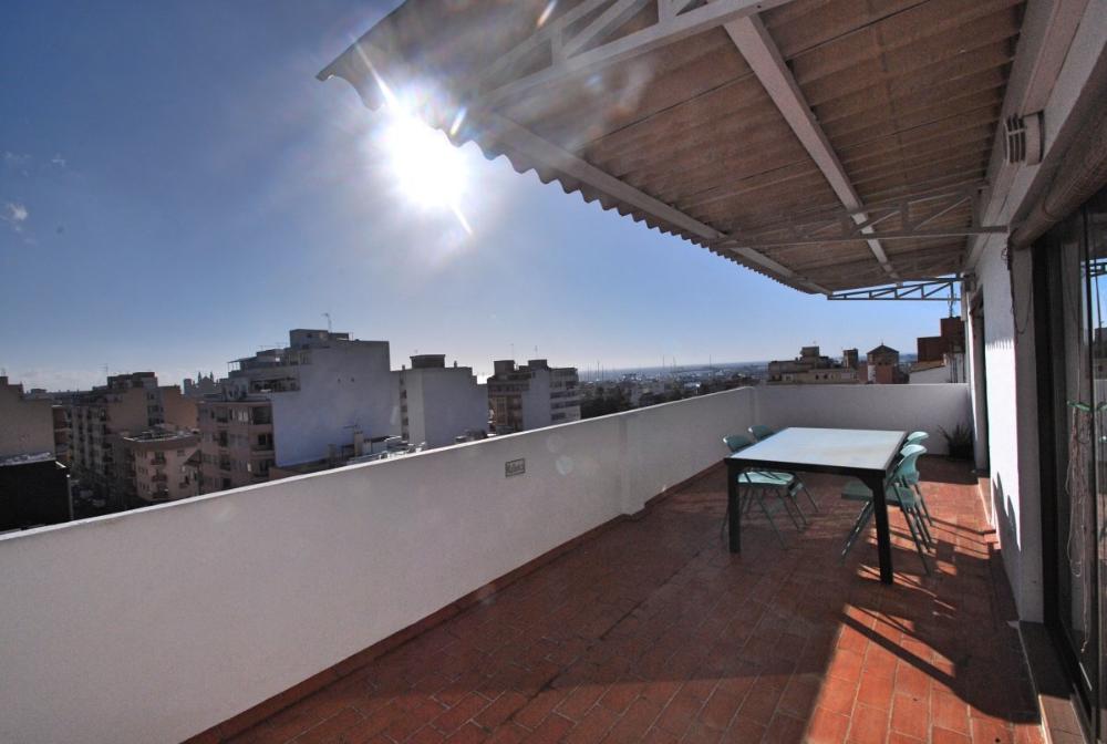 Helles Loft mit Blick bis zum Meer und Hafen in Santa Catalina-Verfügbar für temporäre Anmietung. Diese schöne, lichtdurchflutete Wohnung ist komfortabel und gemütlich eingerichtet. Sie befindet sich im 7. Stock mit Aufzug und besticht durch eine große, südorientierte Terrasse, welche teils überdacht ist und einen wunderschönen Blick über Palma bietet; hin zur Kathedrale und auch zum Meer / Hafen. Sie teilt sich auf in eine voll eingerichtete Küche mit Zugang zur Terrasse und angrenzendem Ess- und Wohnzimmer. Der Wohn- und Essbereich (mit Sofabett) hat große Schiebefenster und somit auch Zugang zur Terrasse. Desweiteren gibt es ein Schlafzimmer und ein Duschbadezimmer. Die Wohnung ist sehr zentral gelegen, angrenzend zum Santa Catalina Viertel und in der Nähe von Supermärkten, Restaurants und Bars. Weitere Ausstattungsmerkmale: Eine schnelle Internetverbindung ist im Mietpreis enthalten.
